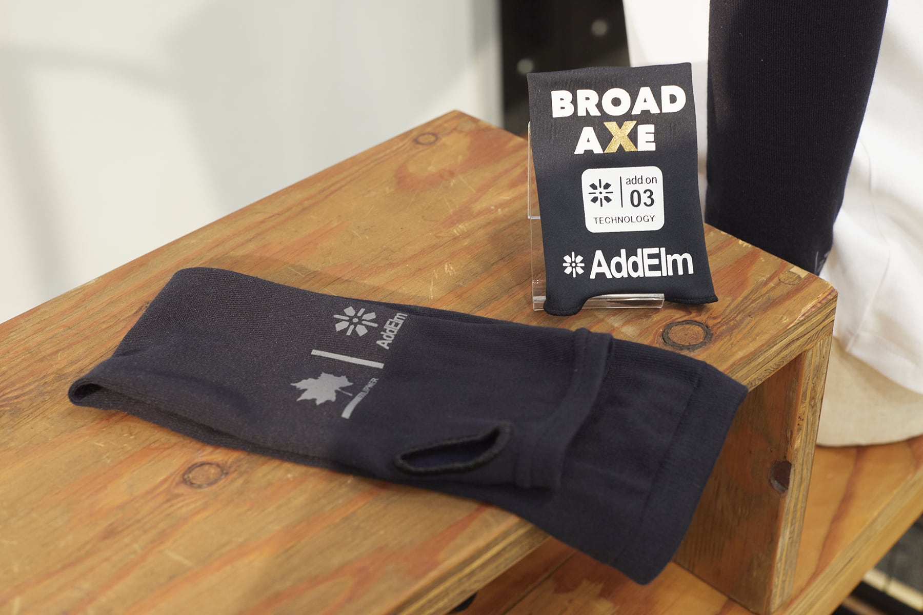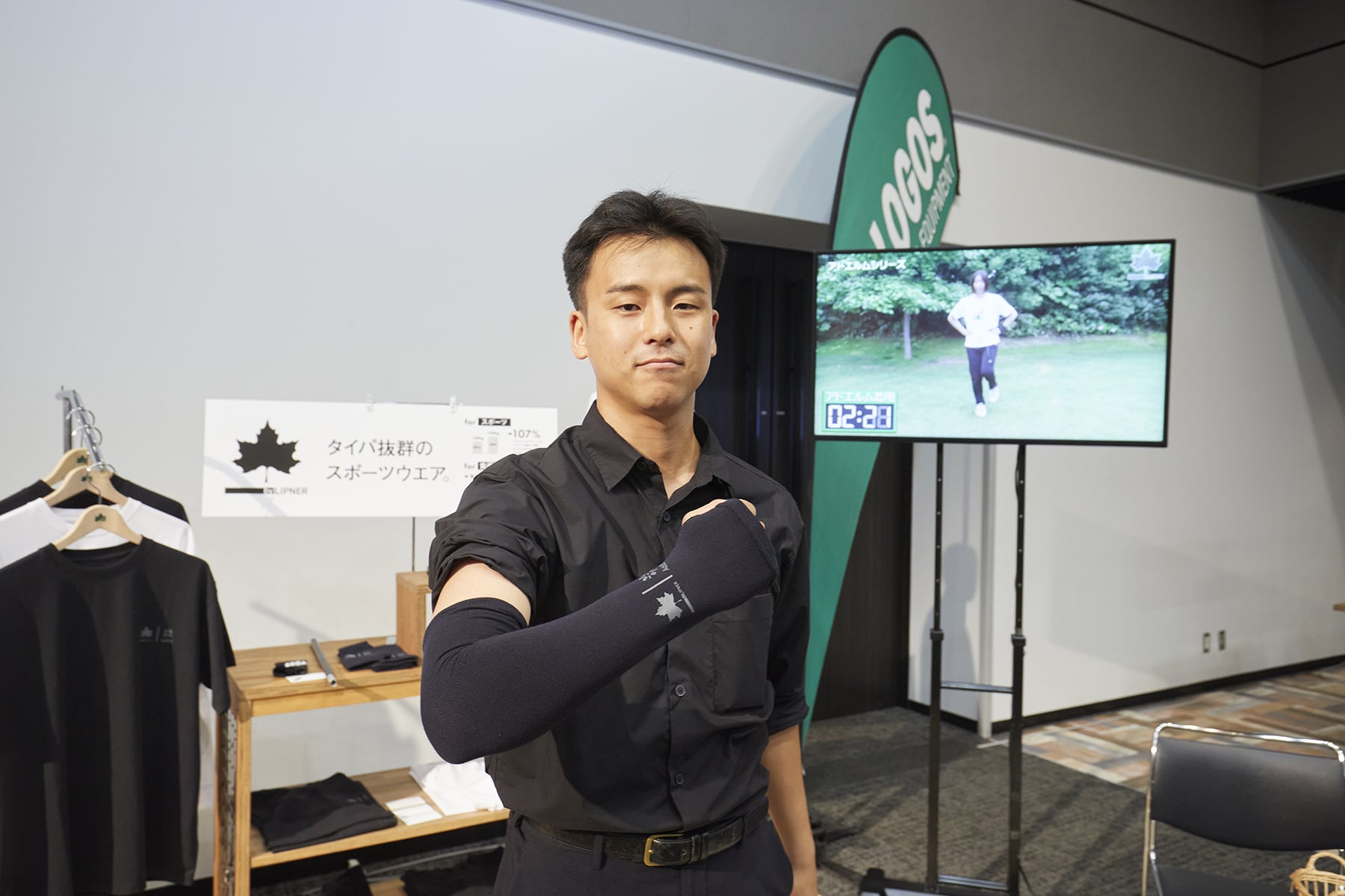 「このアームカバーは、アドエルムという注目のテクノロジーを用いたアイテムなんですけど、鉱石の刺激によってコンディションを整えてパフォーマンスを向上させてくれます。実際に、LOGOSスタッフがアドエルムのリストバンドを着用してデッドリフトというウエイトトレーニングをしたところ、自己最高記録を10kgもUPさせて140kgをあげられたんですよ」