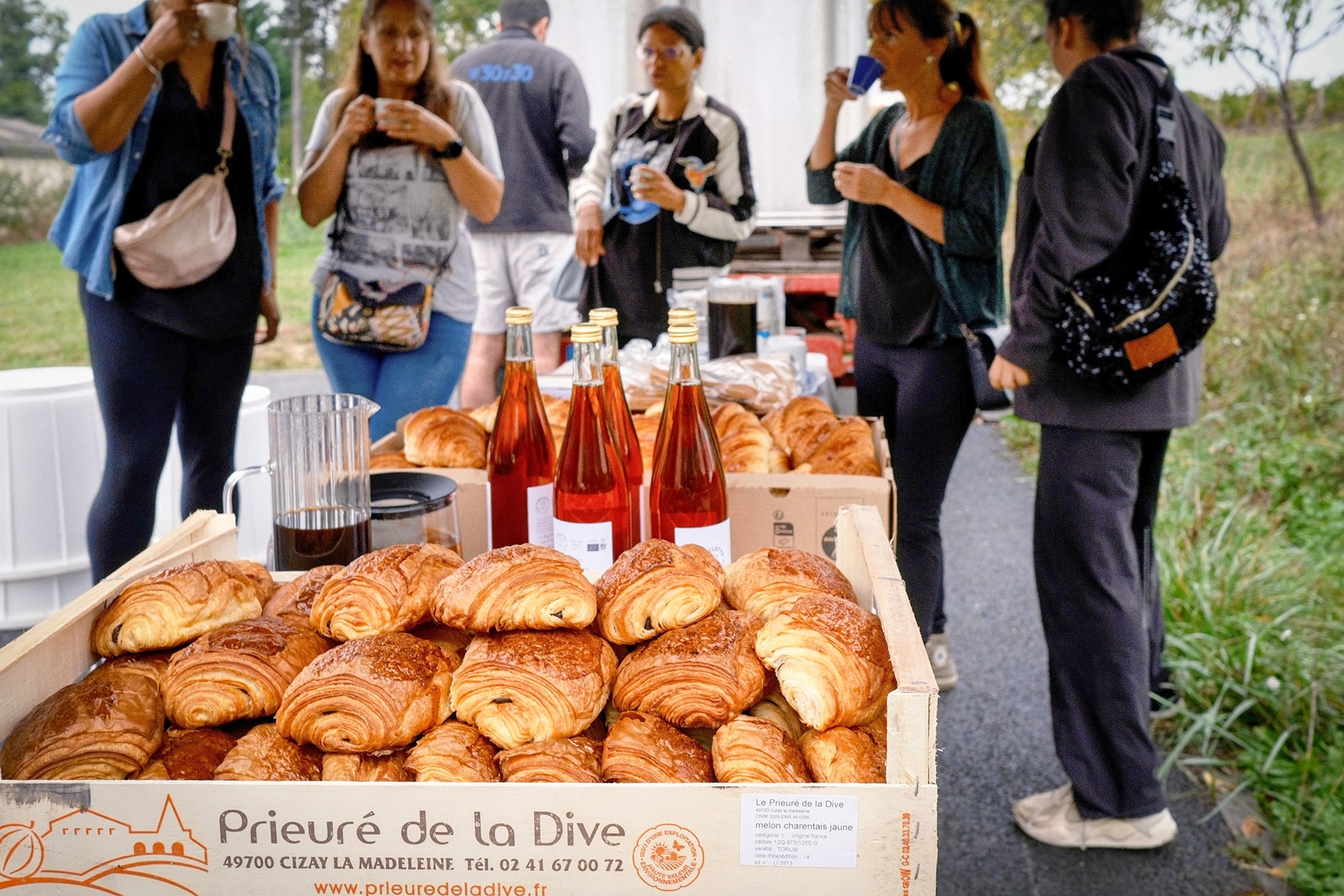 ヴァンダンジュ当日!トゥ―ルーズ、ナントなど遠方から早朝に車を走らせて来た参加者さんも。家族連れ、友人、私と同じおひとりさまなど幅広いメンツです。まずはコーヒーやシャトー特製葡萄ジュースとご近所パン屋さんの大きなクロワッサン、パン・オ・ショコラでプティ・デジュネ!