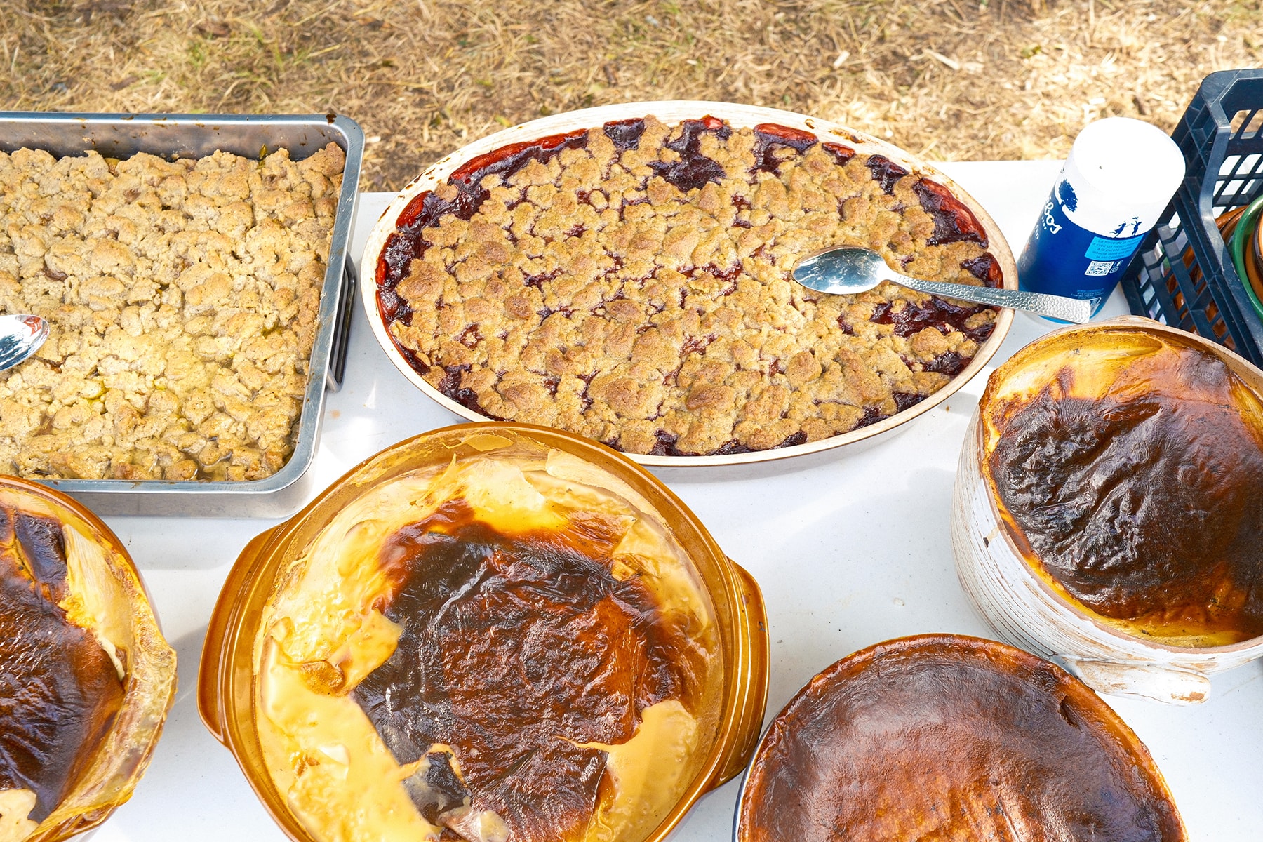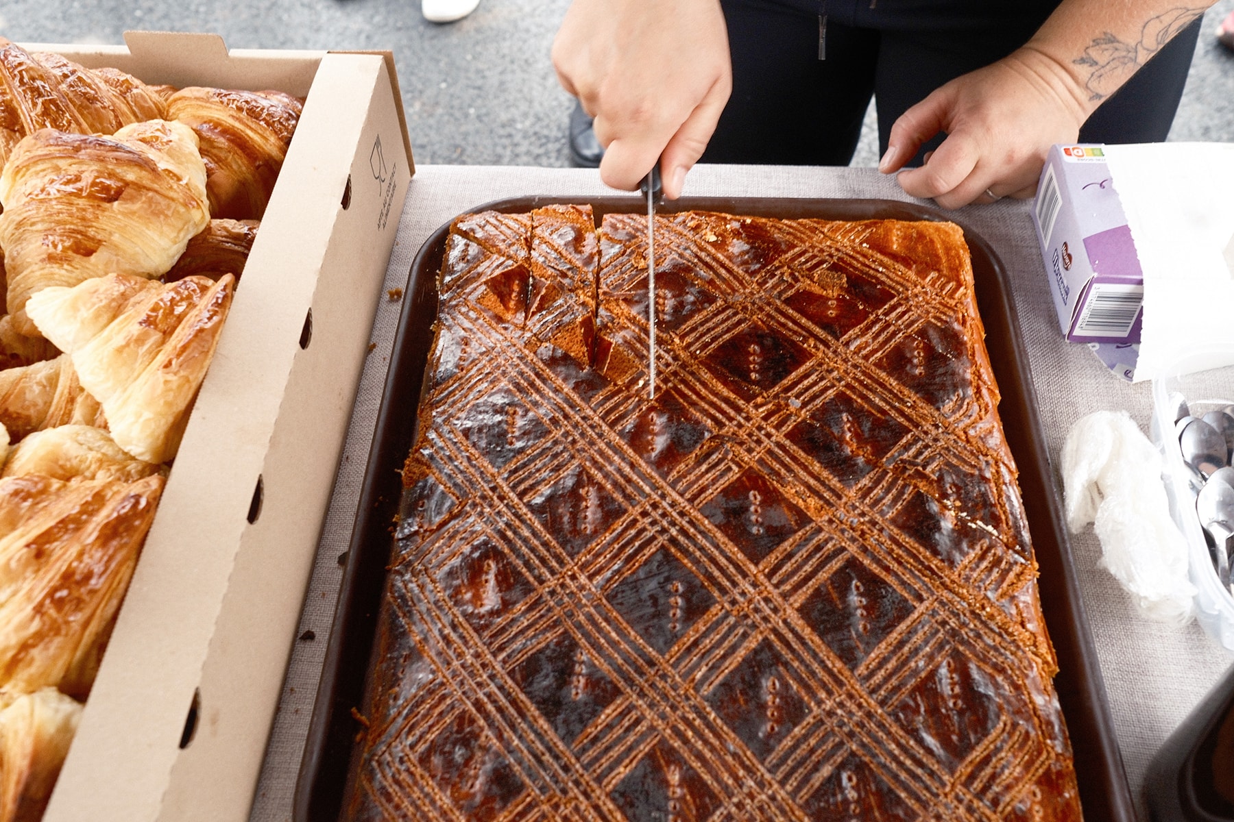 料理の舵取りは、青いエプロンのシルヴィータタ(タタはフランス語で叔母さんの愛称)。ここでしか食べれないシルヴィータタご自慢の絶品ガレット・ブルトンヌ(ブルターニュ地方のバターたっぷり焼き菓子)の登場に歓声が上がります。この恍惚とした焼き色よ!