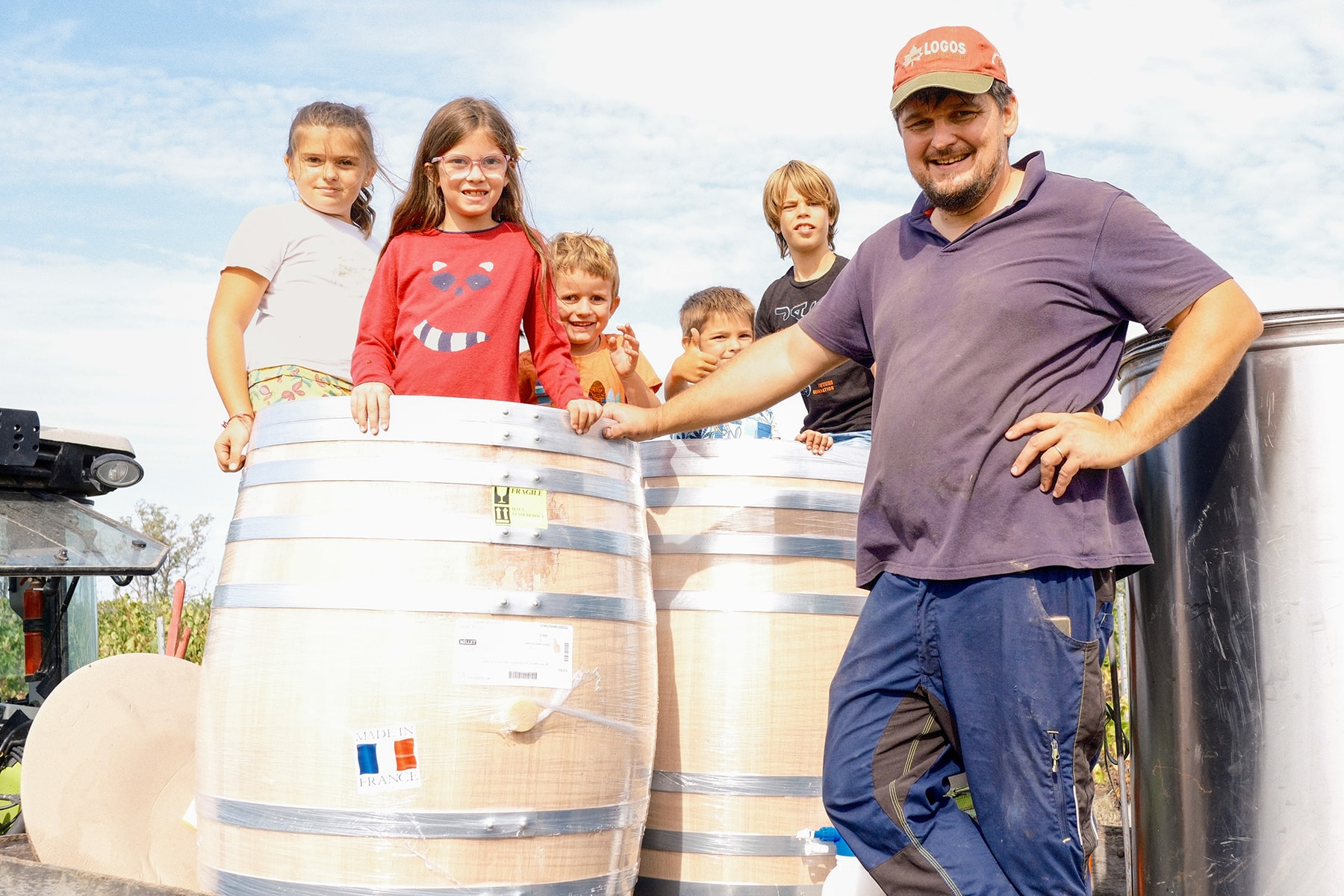 籠1杯の葡萄は25キロ前後! フランス産アカシア樽に移したら……。子供たちが一斉にステップを踏んで、かわいい葡萄ダンスの始まりです。