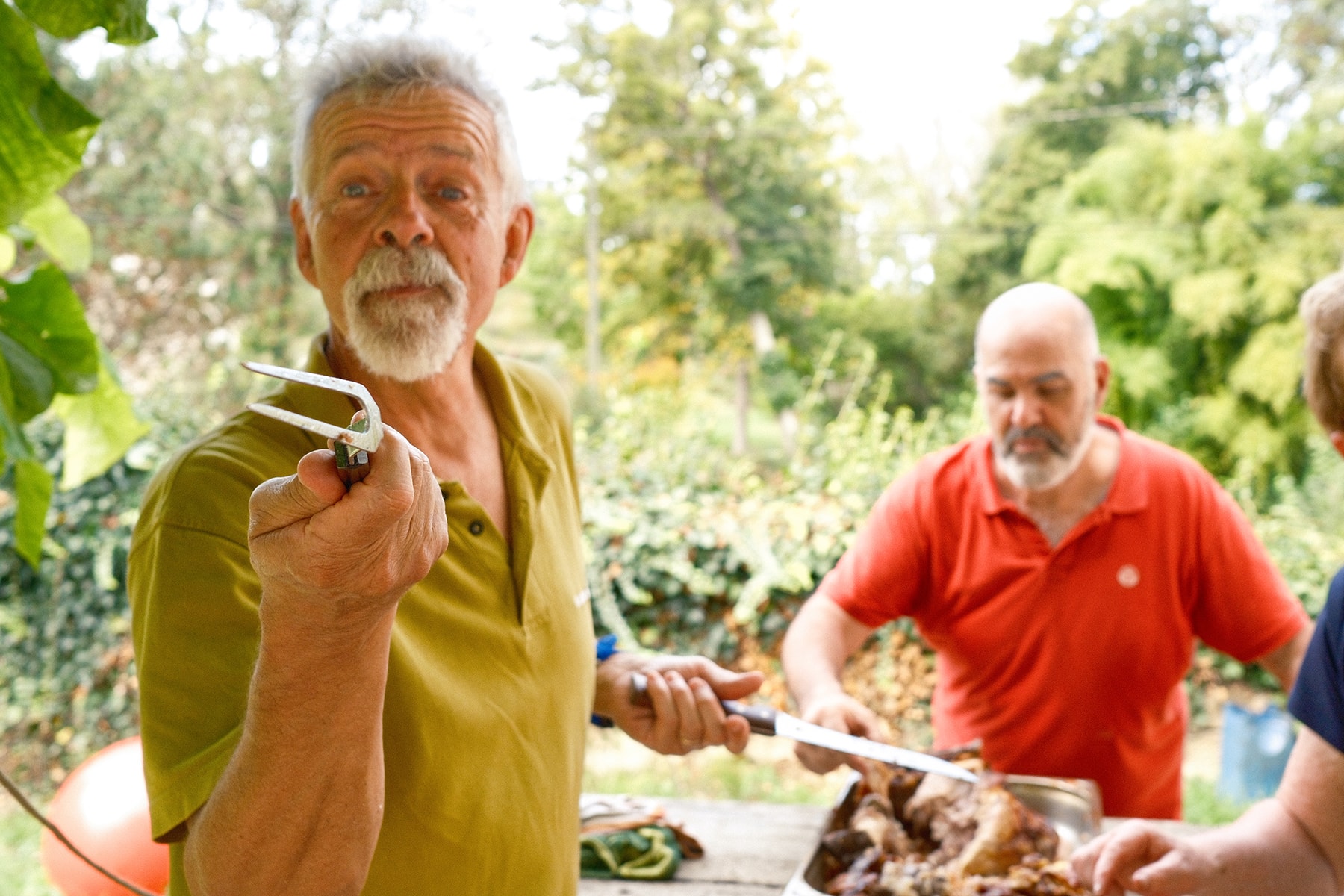 これぞフランスの秘技! まな板要らずのナイフ使い。抱えているのはパンですが、バイオリンを奏でているようなエウェンの叔父さんのジルベール。