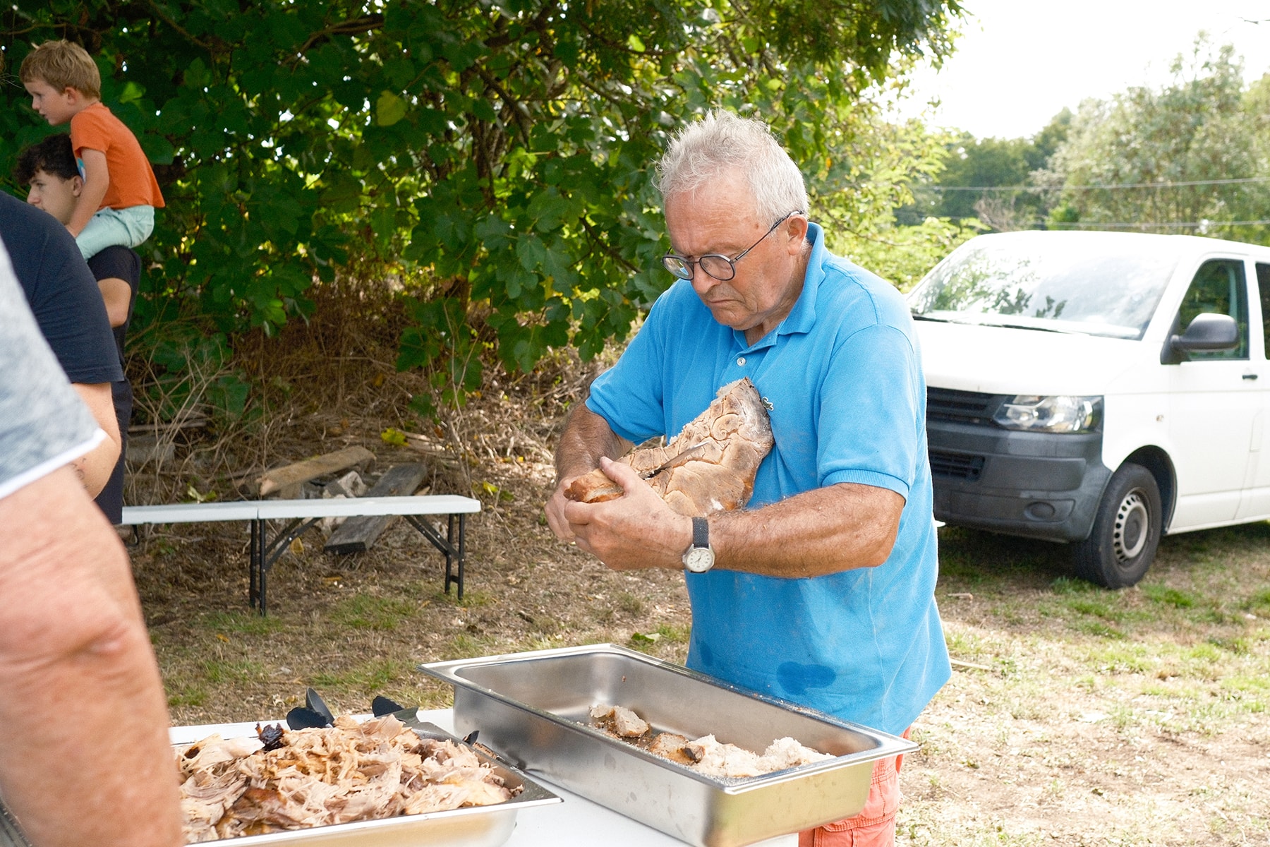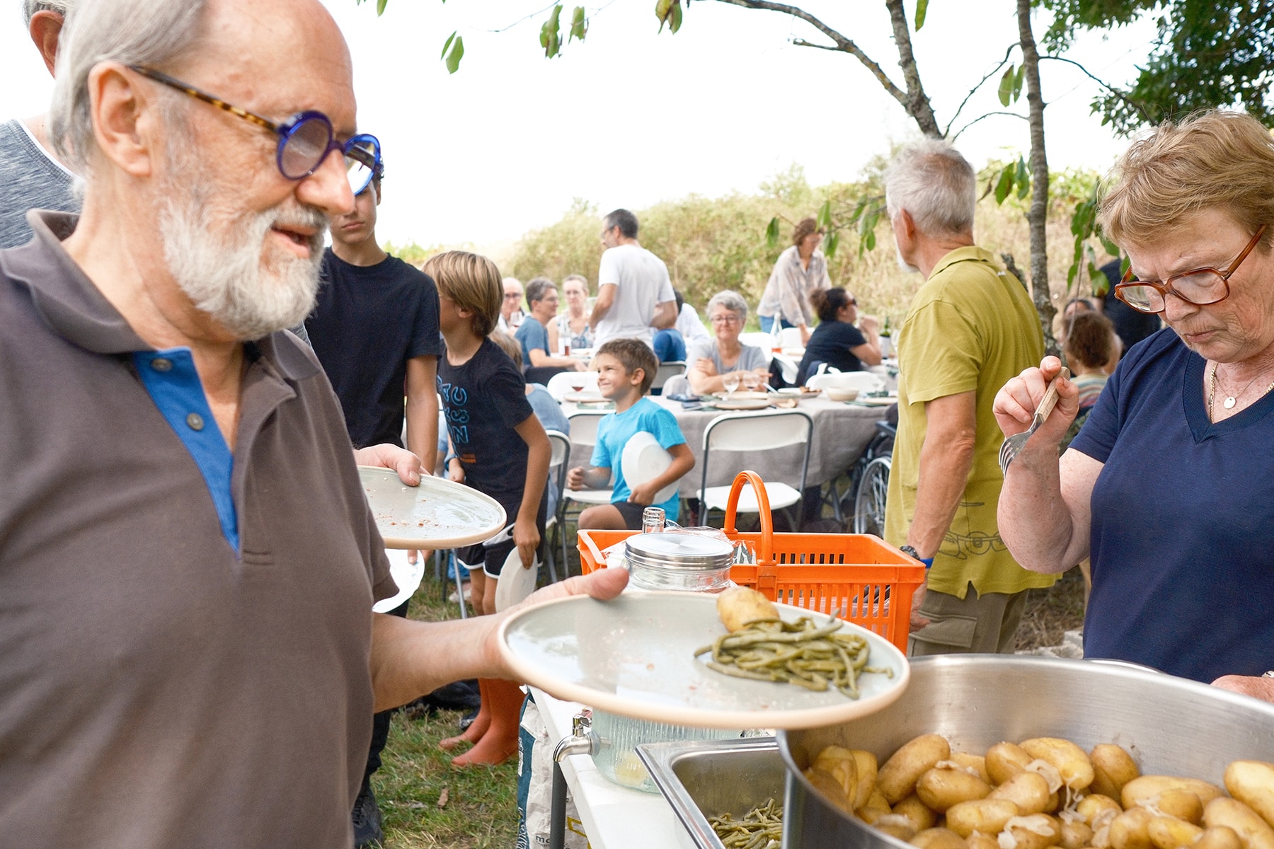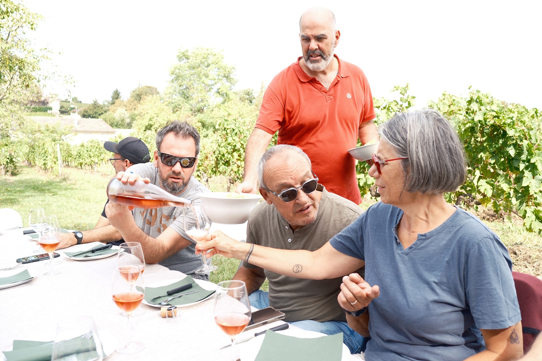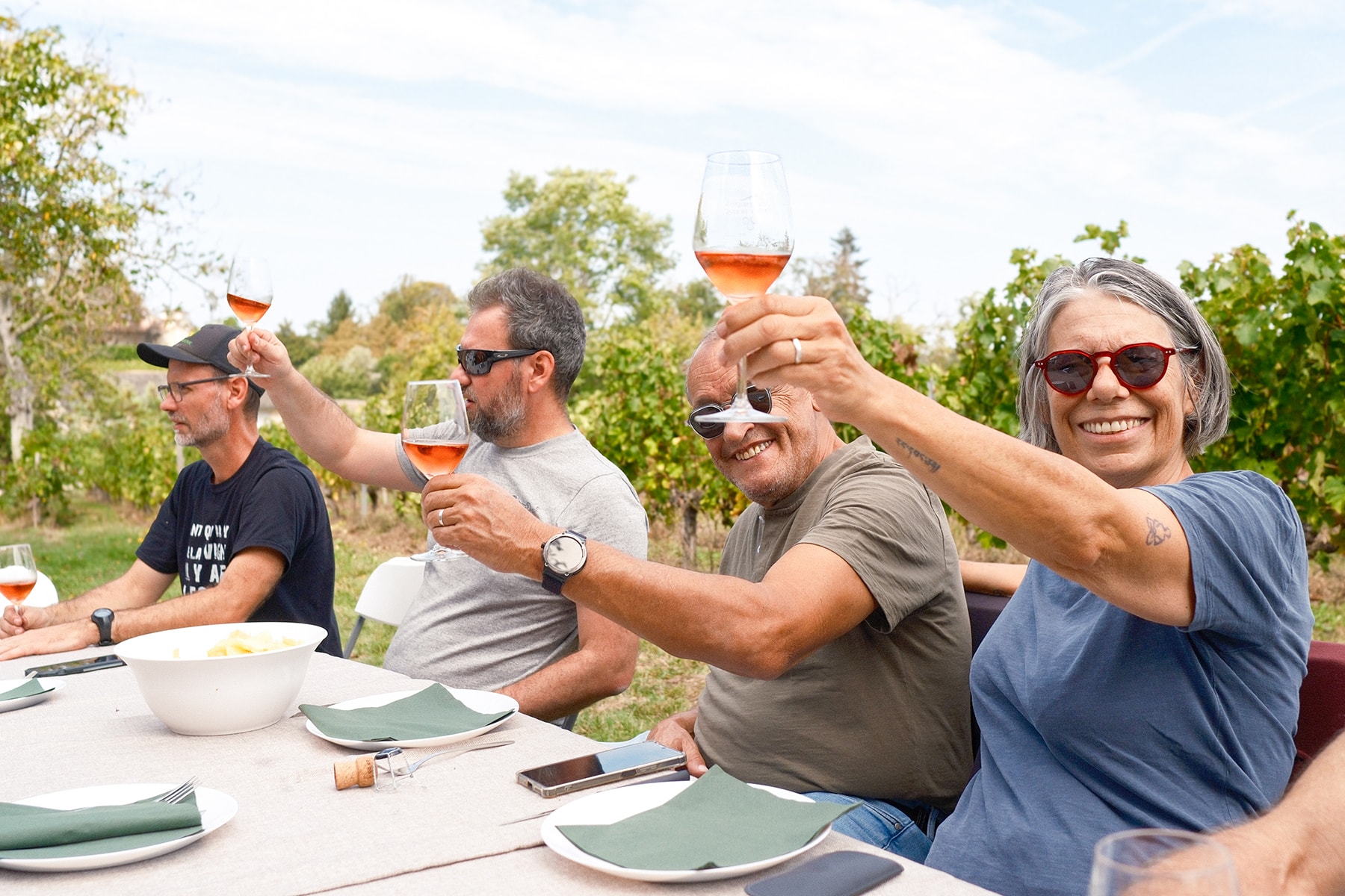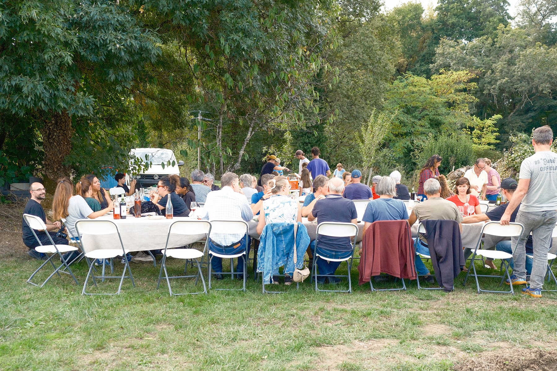 収穫後はお待ちかねのヴァンダンジュ食堂開店。通常のヴァンダンジュでも、葡萄畑でみんなで長テーブルを囲みボリュームある料理とワインで収穫作業の活力にします。