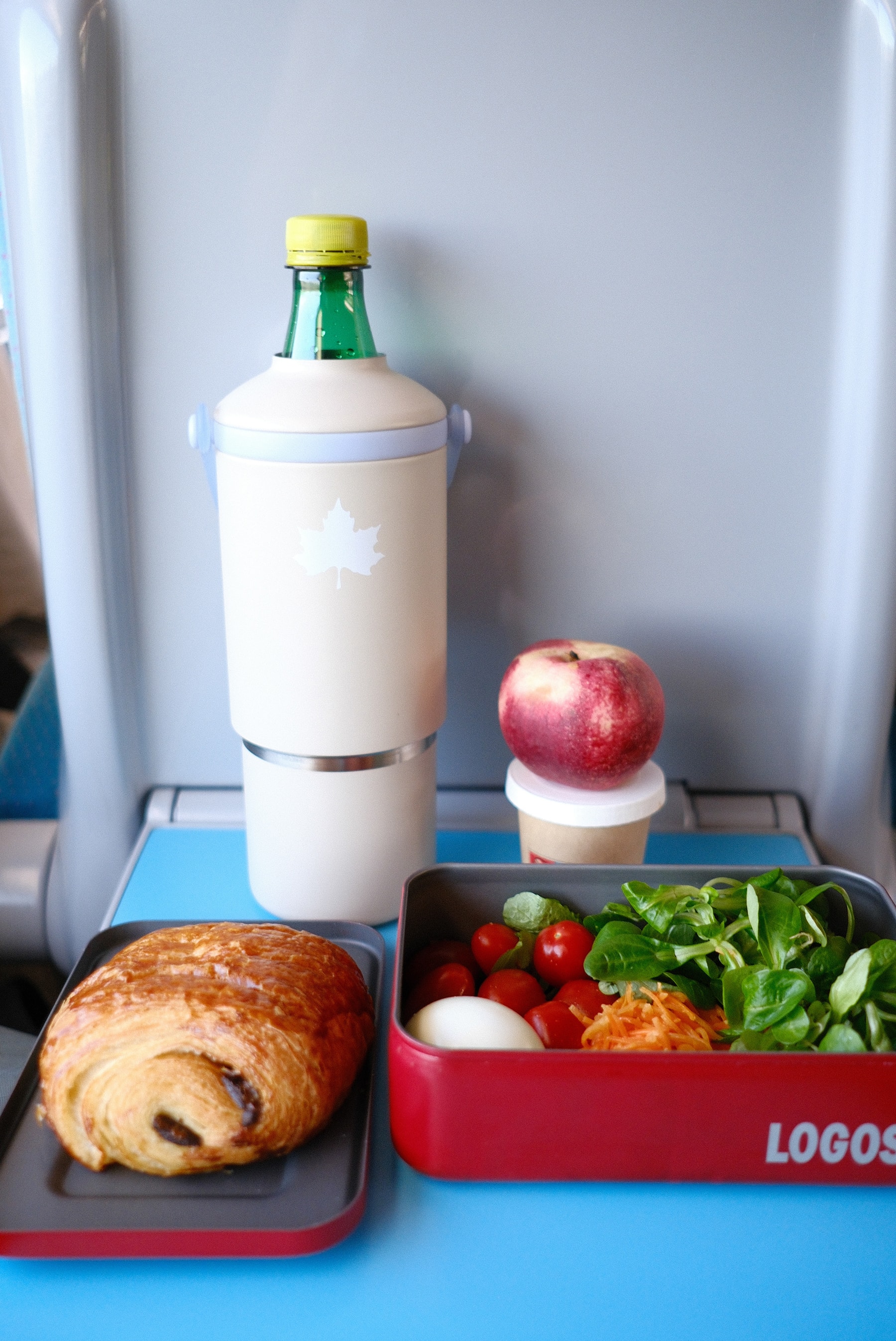 旅するメスキットはお弁当箱にも。さらなる相棒の「真空「温・冷」ペットボトルシリンダー」(※写真の新色は2026年1月発売予定)には、「倍速凍結・氷点下パック コンパクト(2pcs)」を入れたので、ペリエ(南フランス産炭酸水)はず~っと冷え冷えのシュワシュワ~。