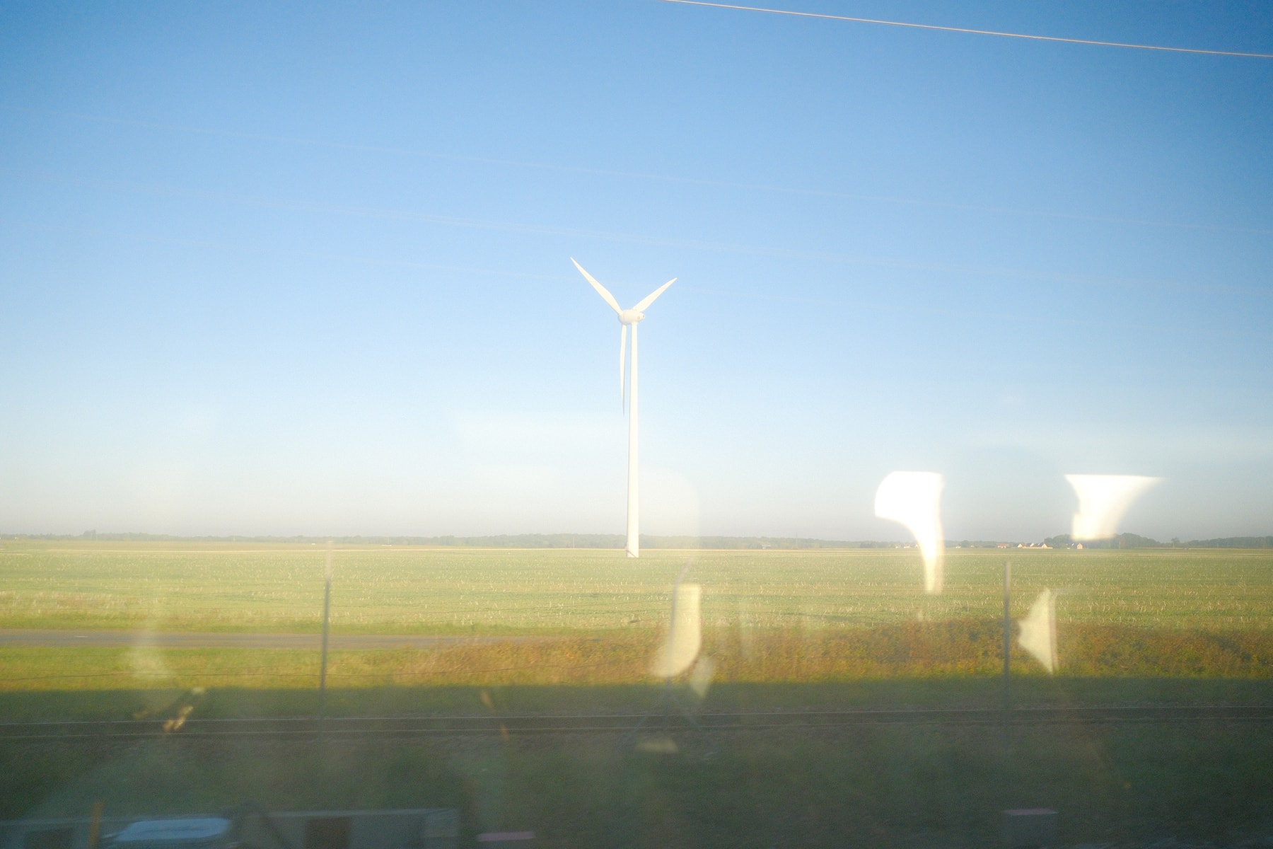 車窓から顔を覗かせたのは……。電力消費を再生可能エネルギーで賄うための風力発電機。青い空に緑広がる大地で気持ちよさそうに羽を回していました。