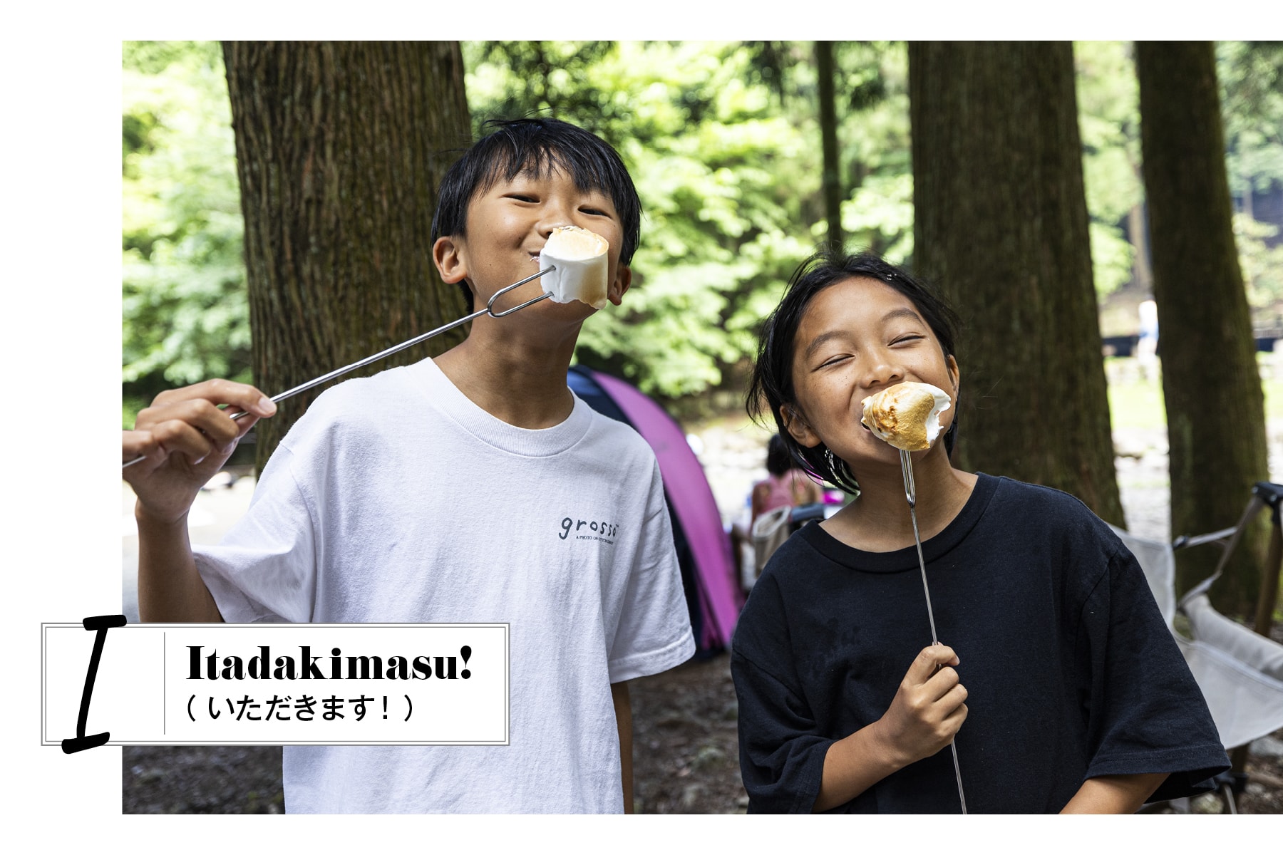 またまたEnjoyの天才こと、笑顔のキッズの登場です。7月号の木空(コア)くんと慧人(ケイト)くん。慧人くんは、たき火が大好きで、この日は親友といっしょにマシュマロ焼きを「いただきます!」だったのでした。