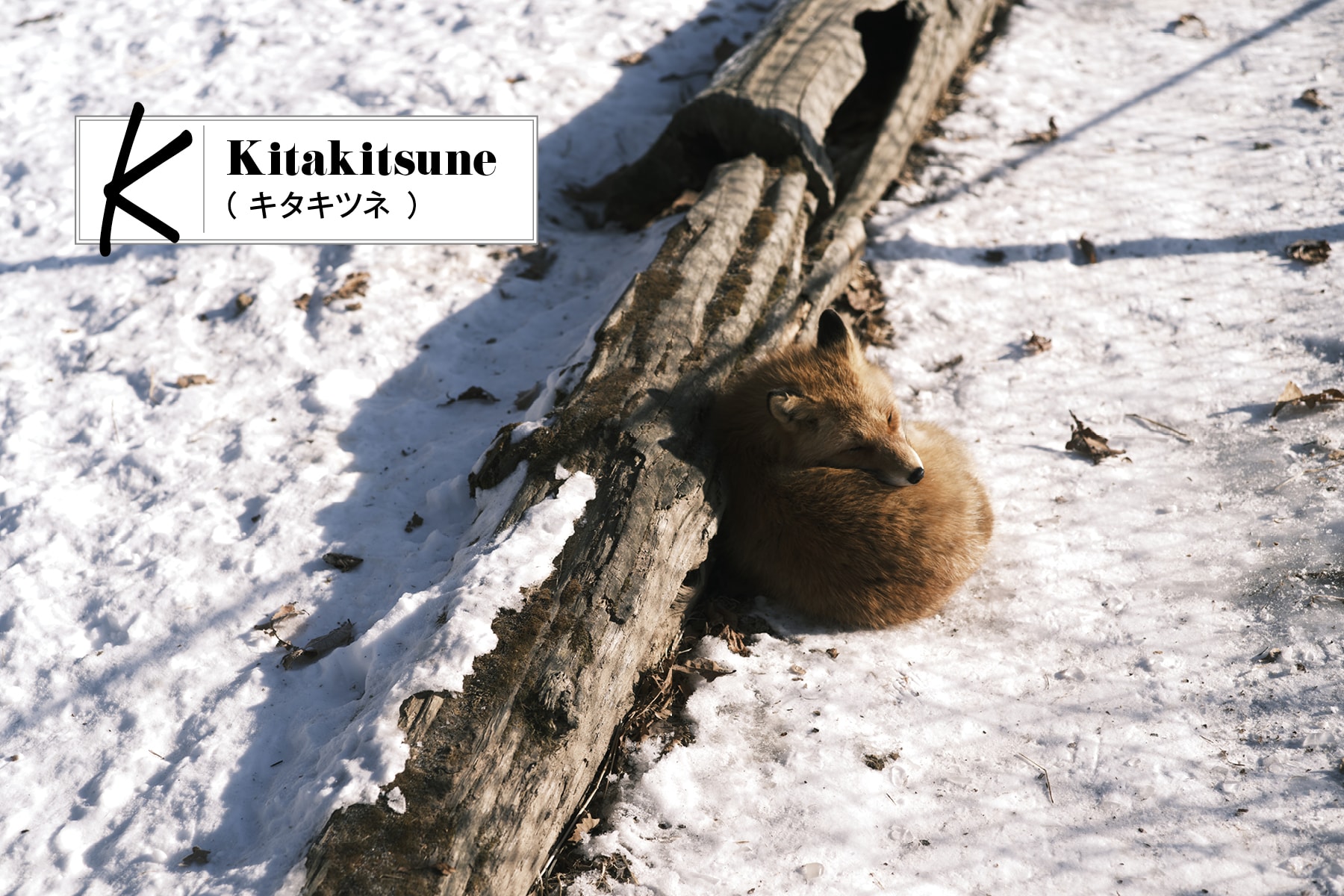 キタキツネとエゾタヌキが放し飼いエリアでいっしょに生活している日本唯一の動物園で、白い雪の上に寝ている、キタキツネを発見。
