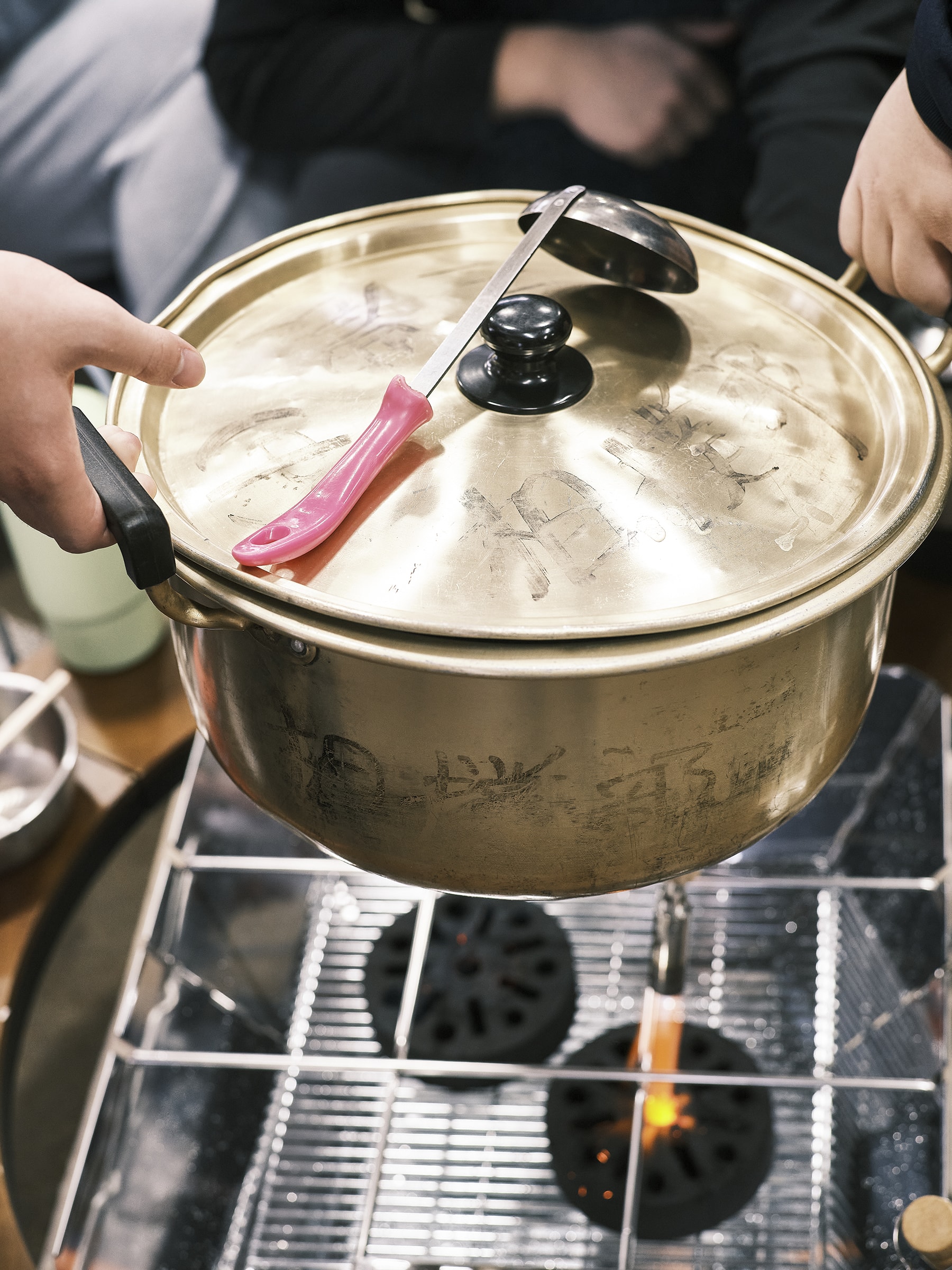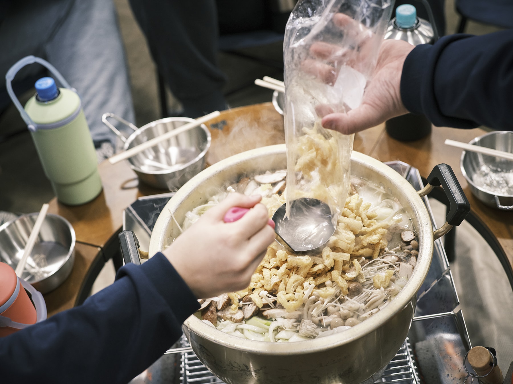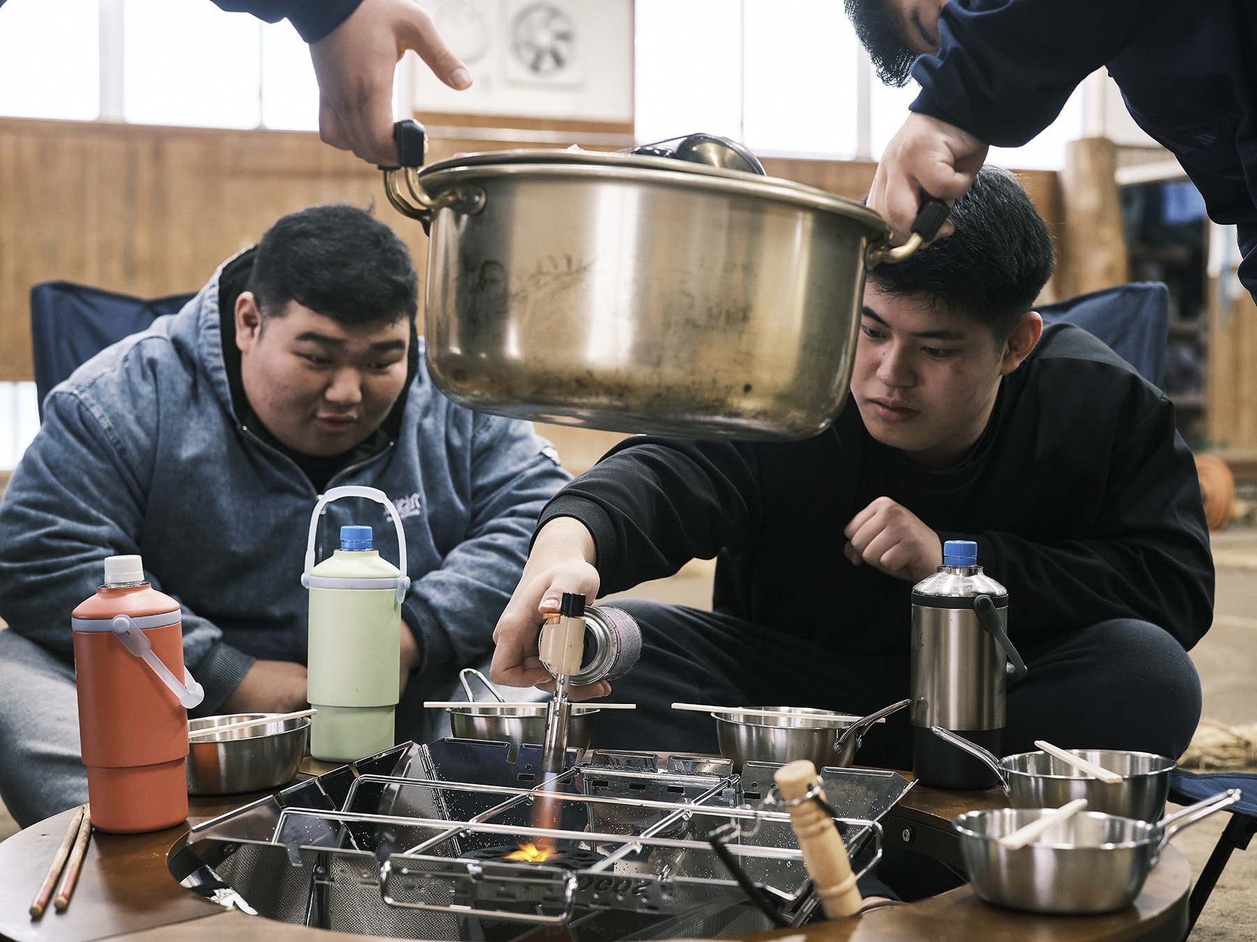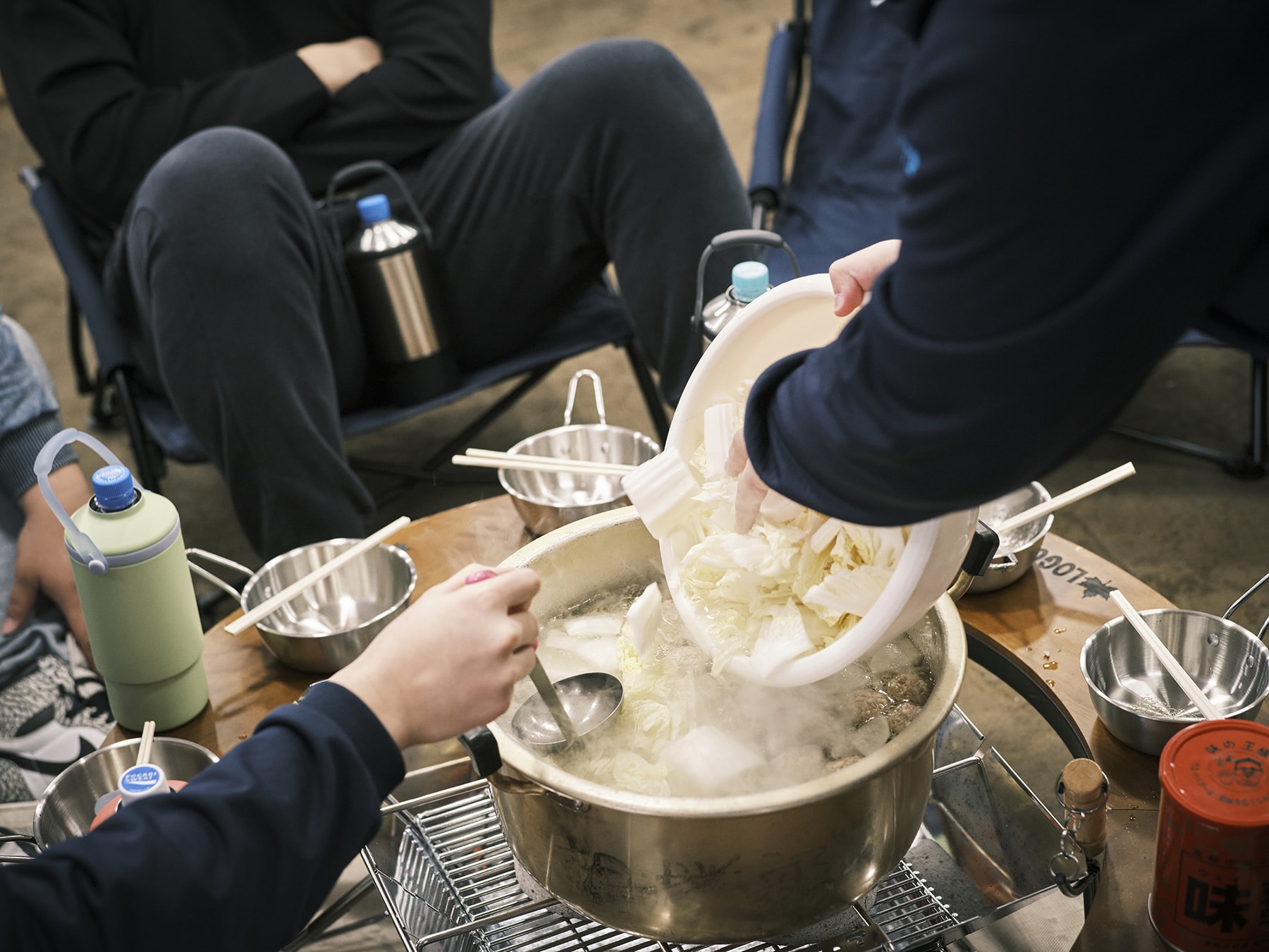 ちゃんこ鍋づくりに大活躍するメインアイテムは、「LOGOS the ピラミッドTAKIBI XL」と「アイアンウッド囲炉裏サークルテーブルL」!