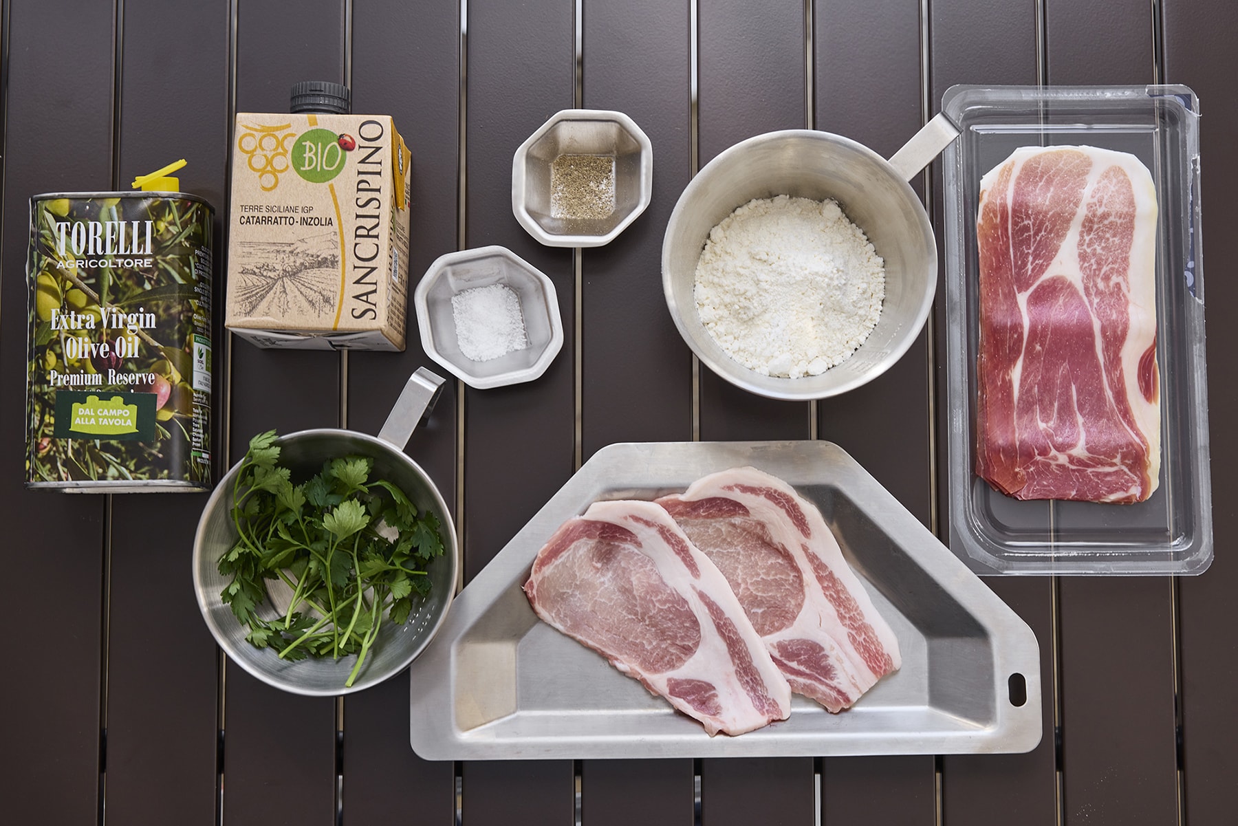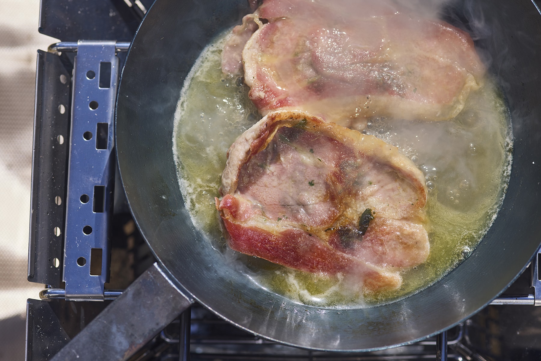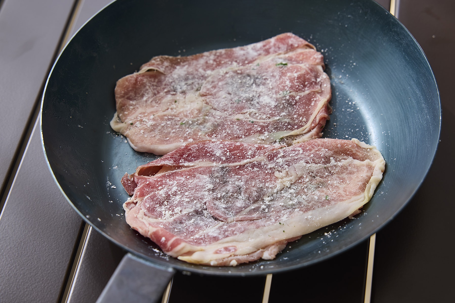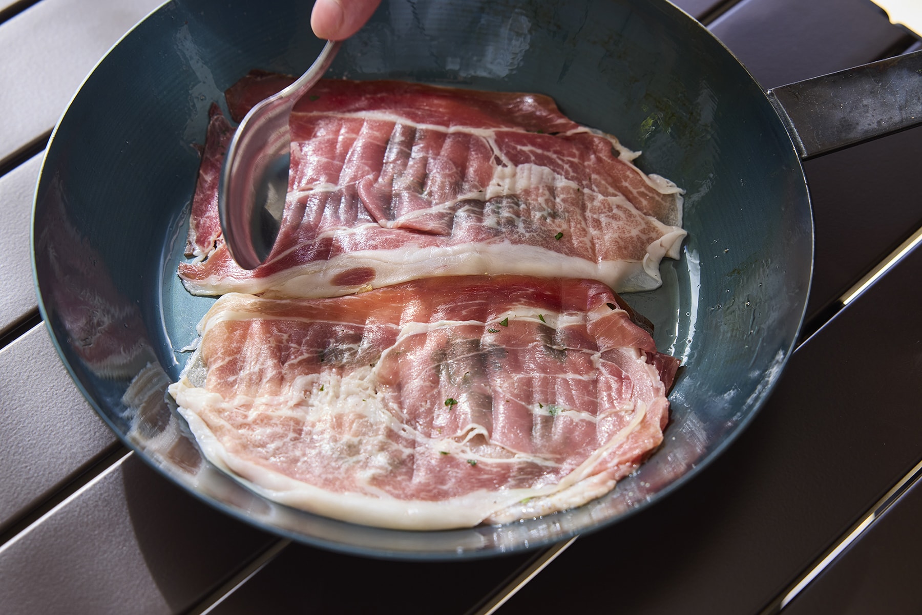 POINT! 生ハムの面から焼き始めると、香ばしさや旨みが豚肩ロースにしっかり移る。