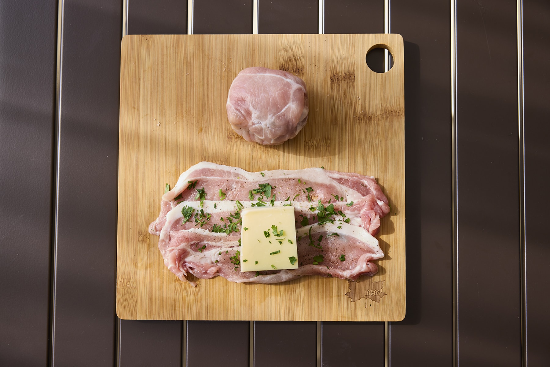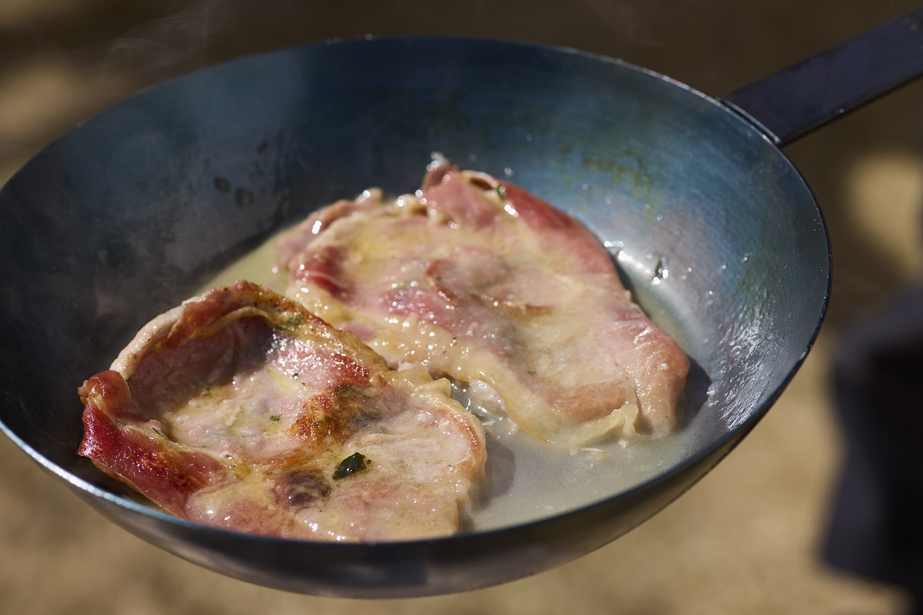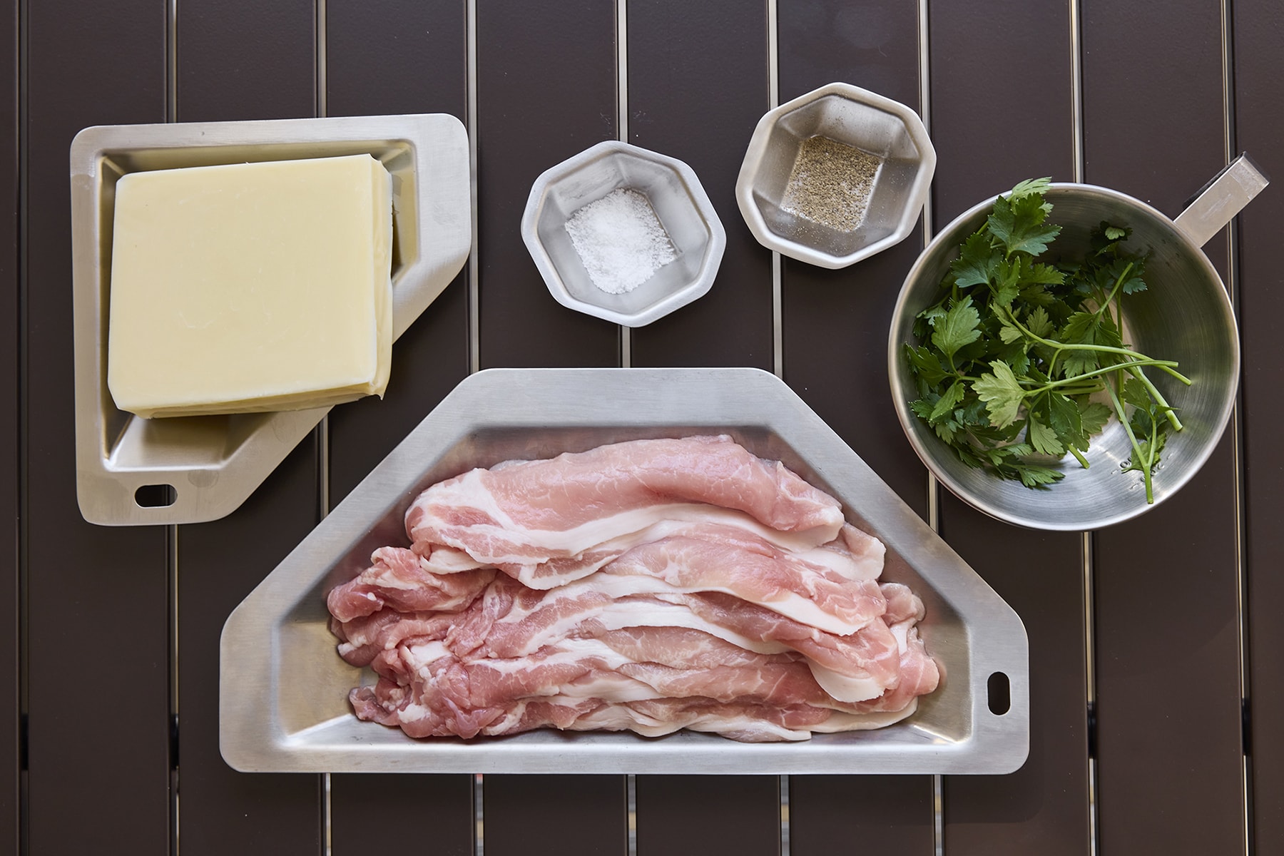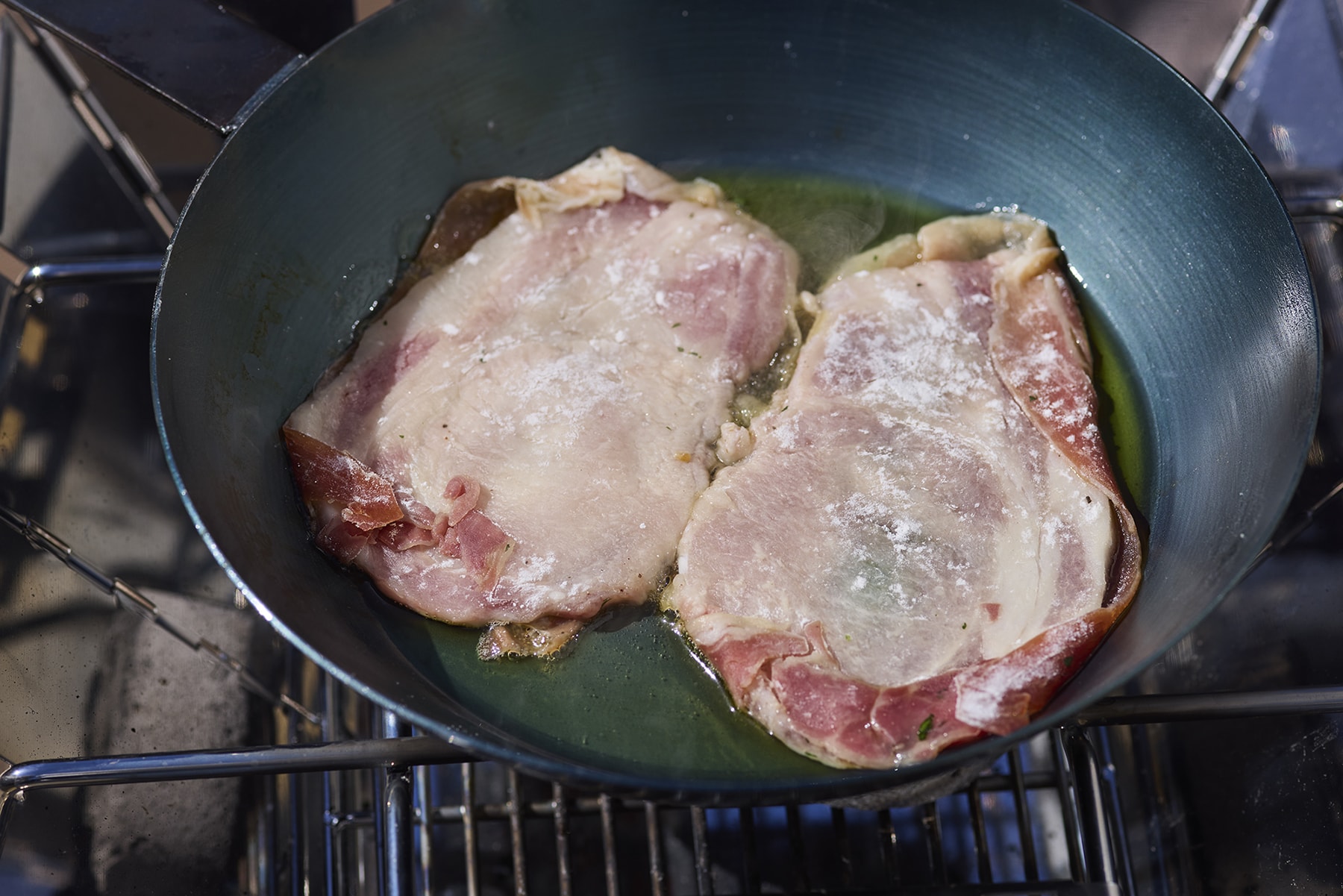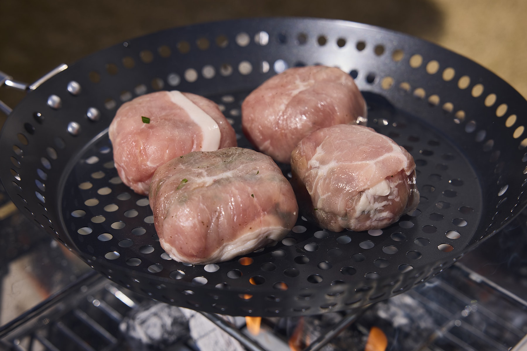 1. 「LOGOS 鉄の職人たき火パン24」に、豚ロース肉を並べ、上からハーブを散らし、生ハムを重ねる。