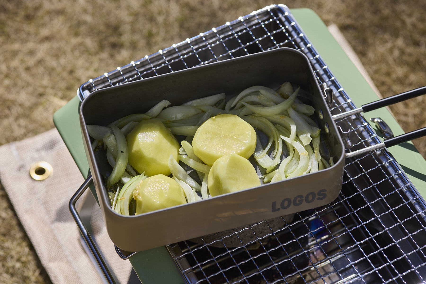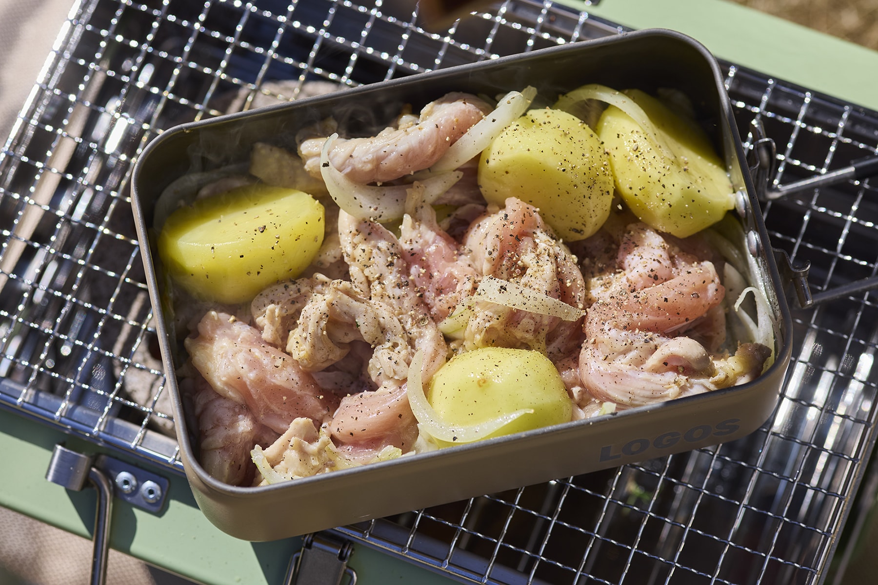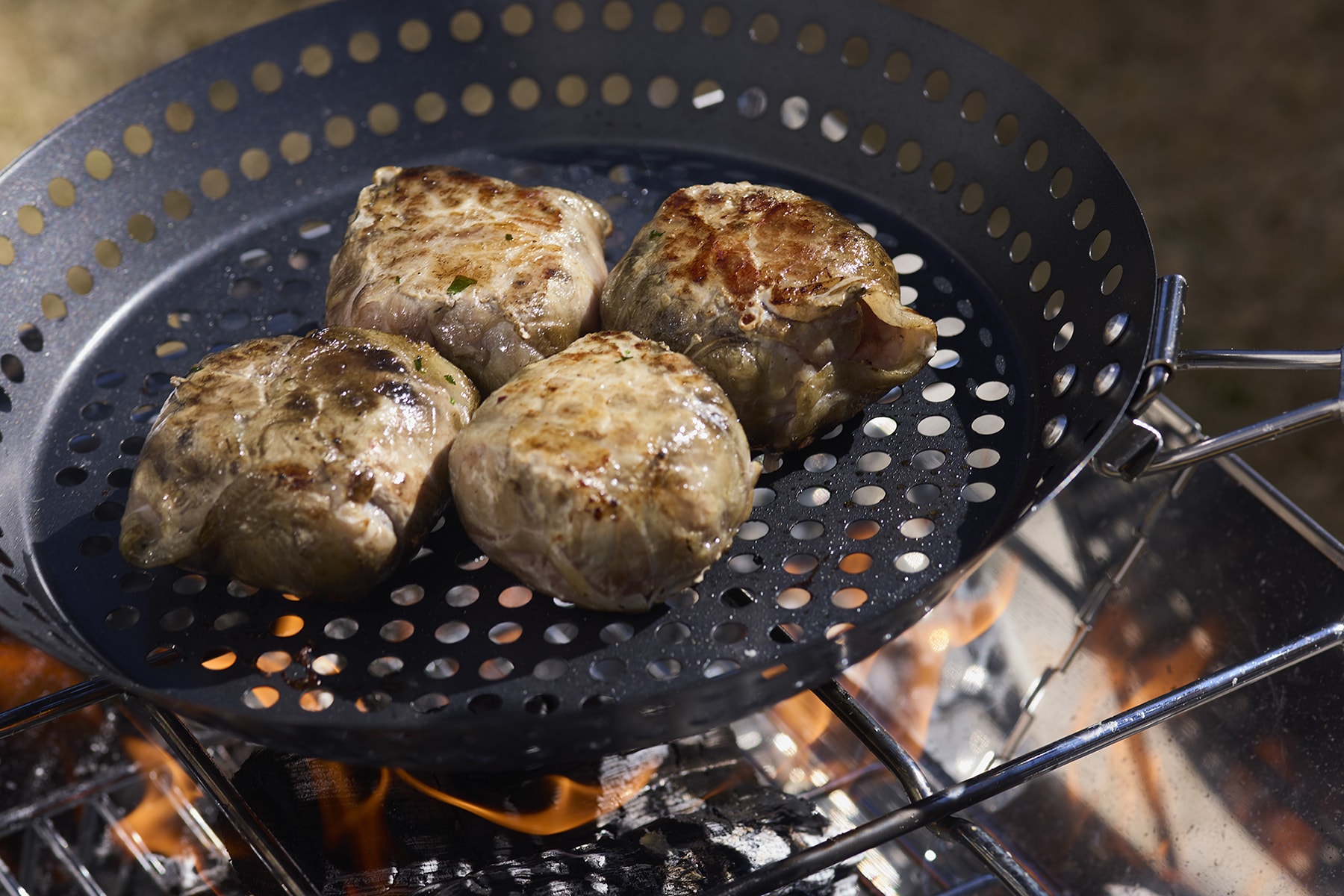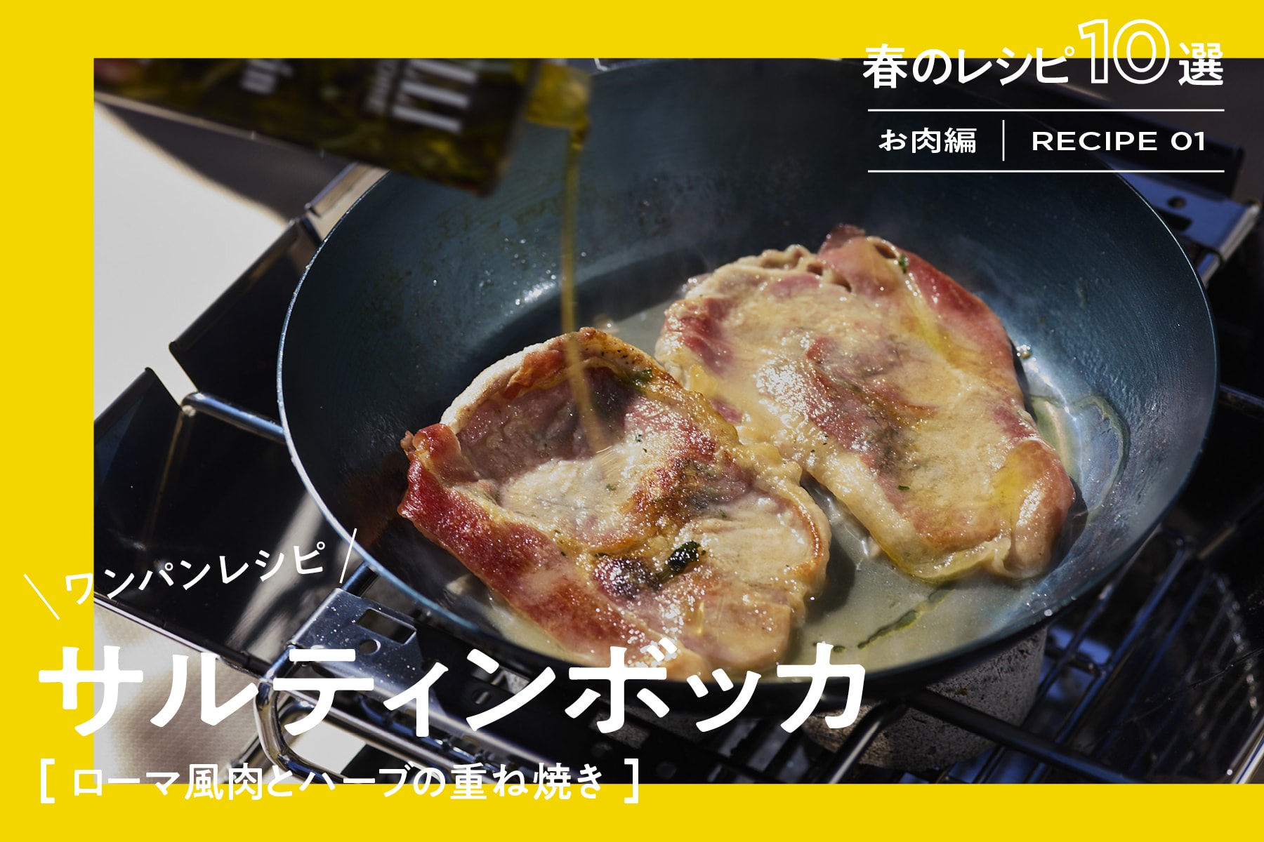 1. 「LOGOS 鉄の職人たき火パン24」に、豚ロース肉を並べ、上からハーブを散らし、生ハムを重ねる。