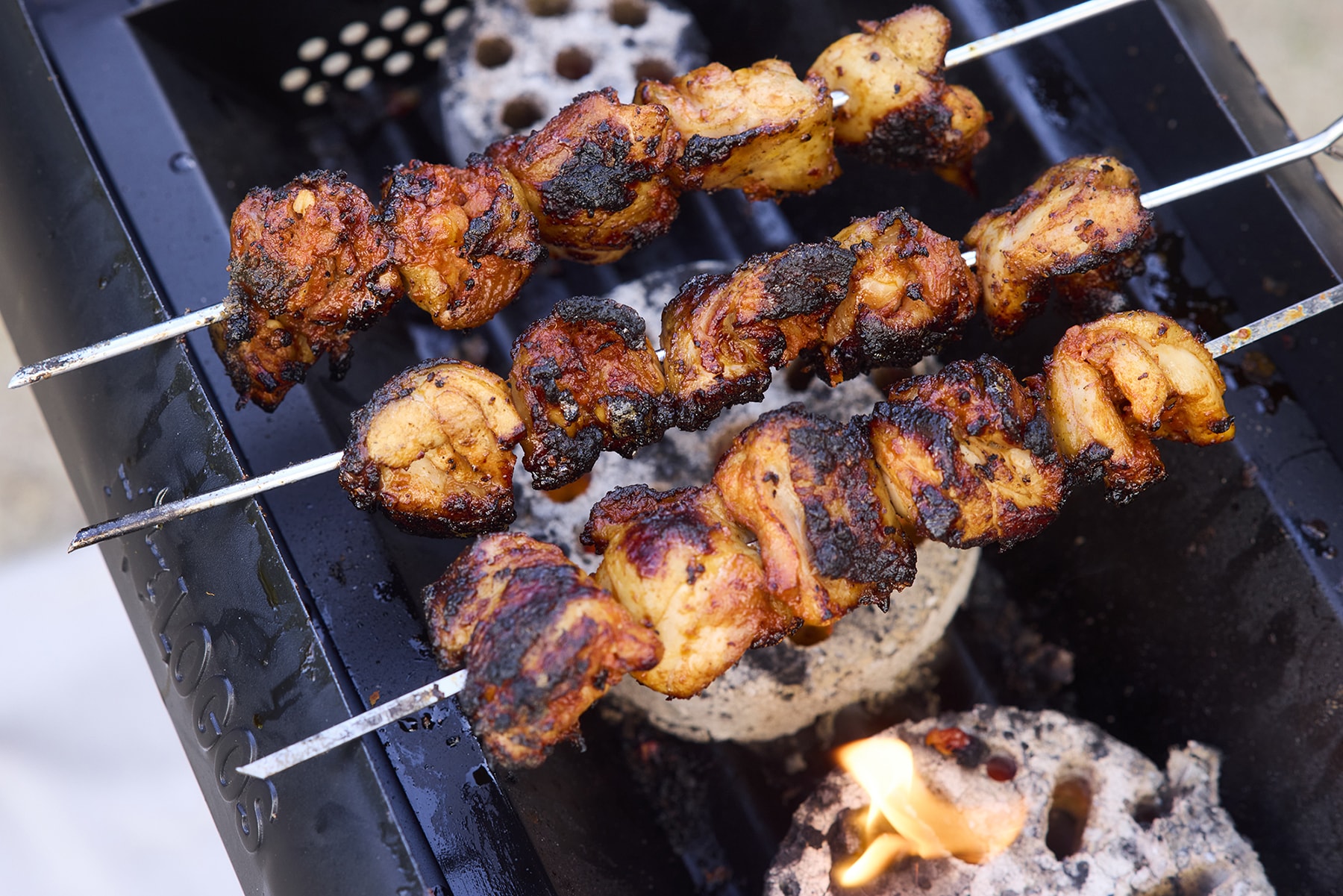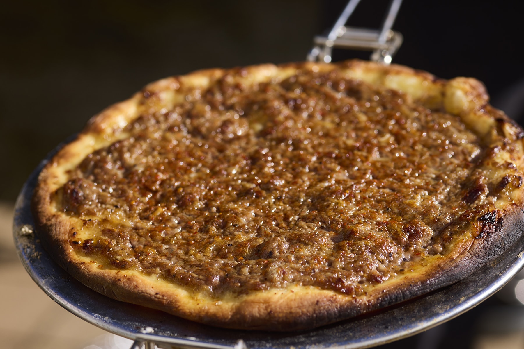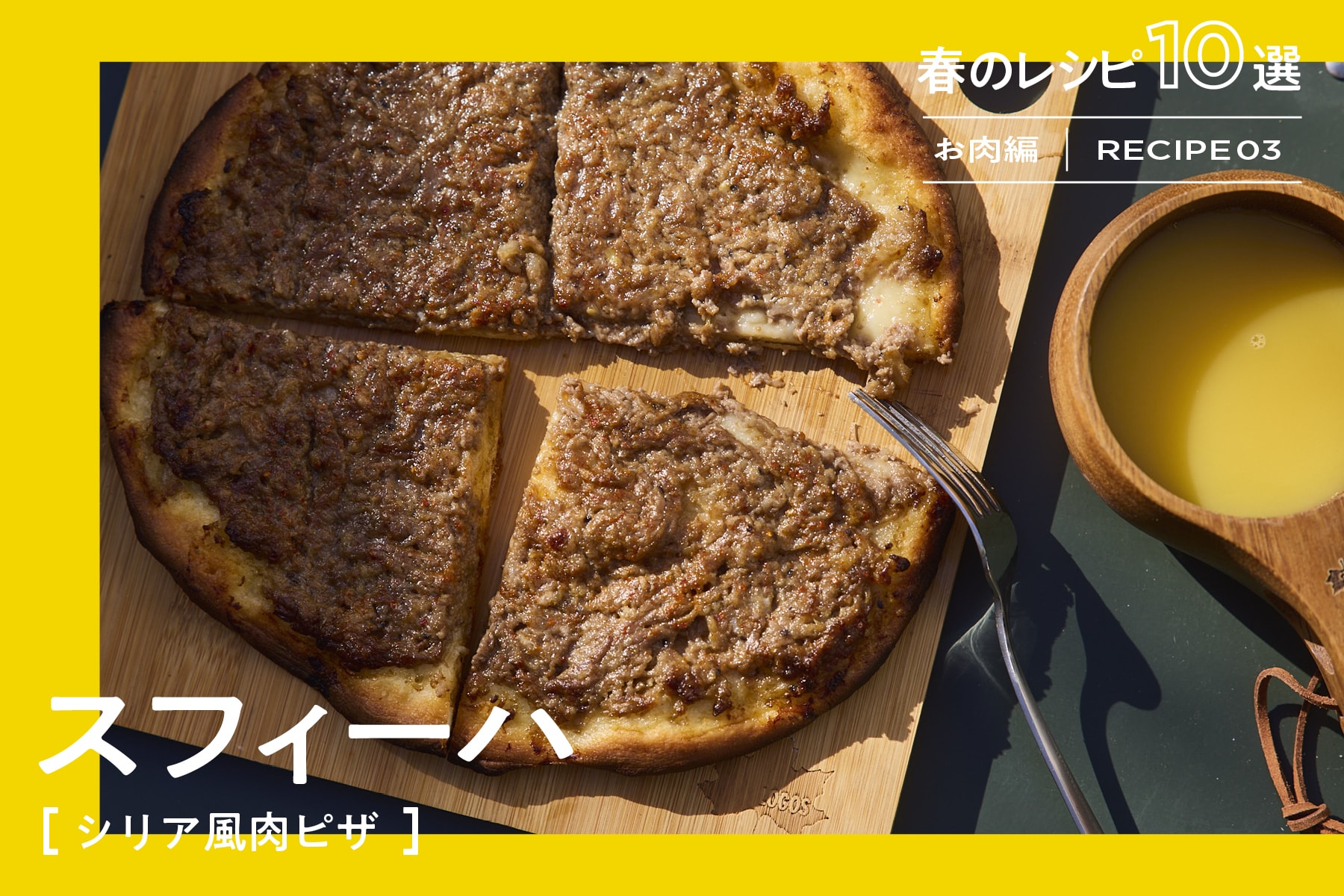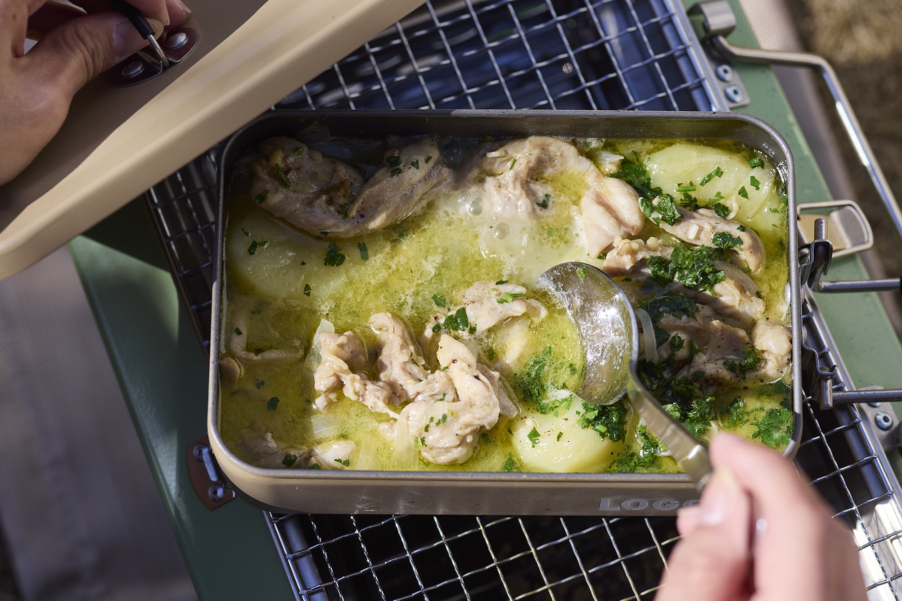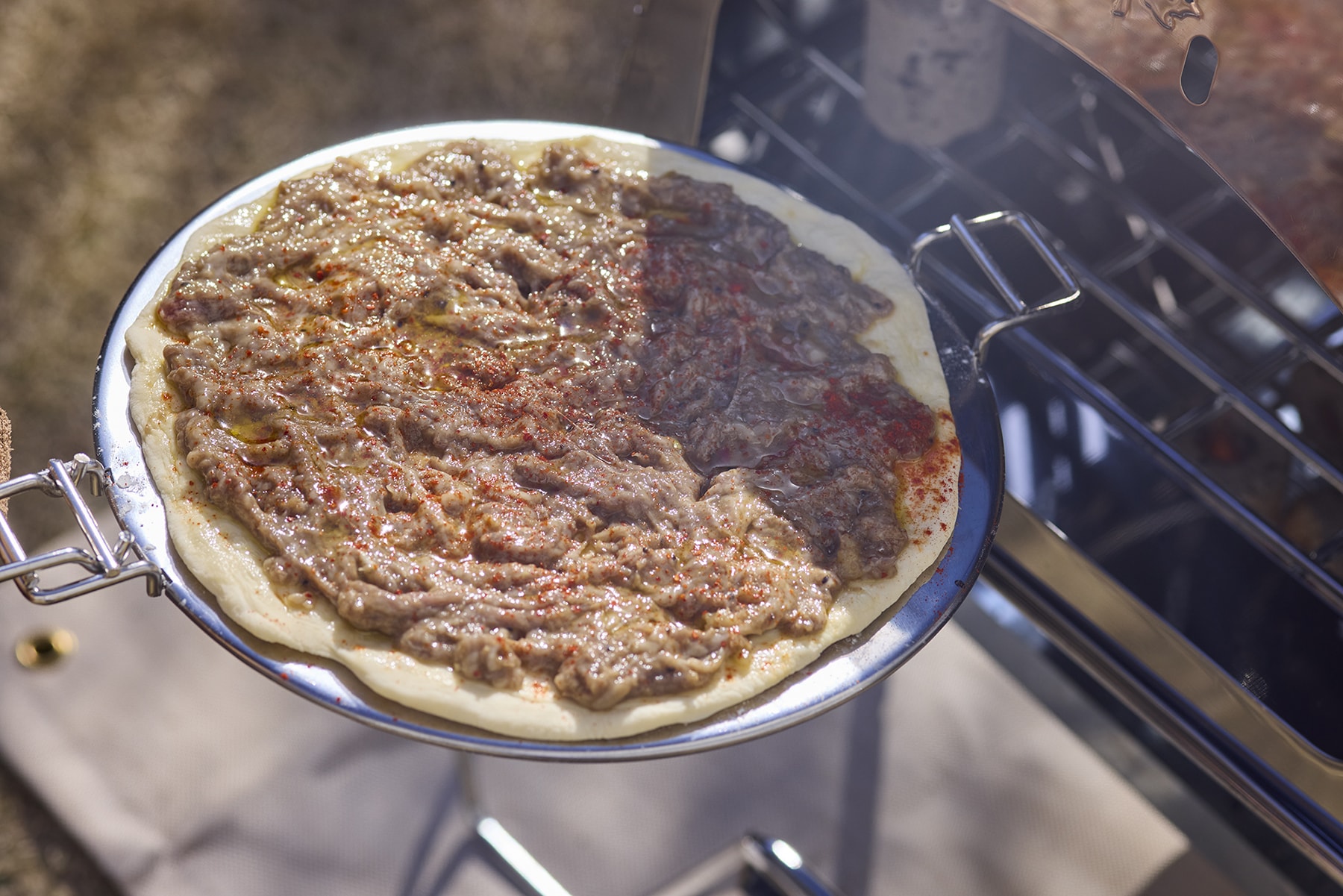 1. 「LOGOS 鉄の職人たき火パン24」に、豚ロース肉を並べ、上からハーブを散らし、生ハムを重ねる。