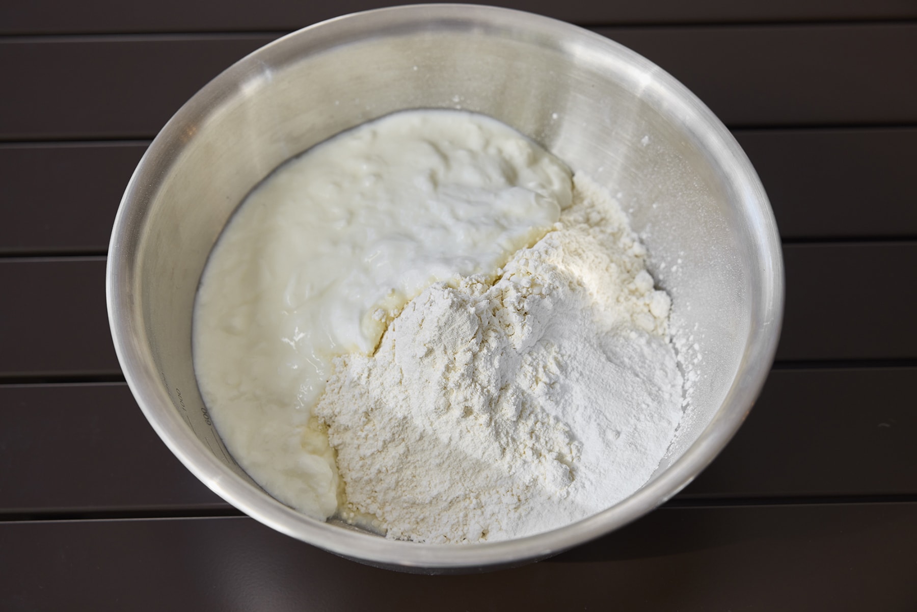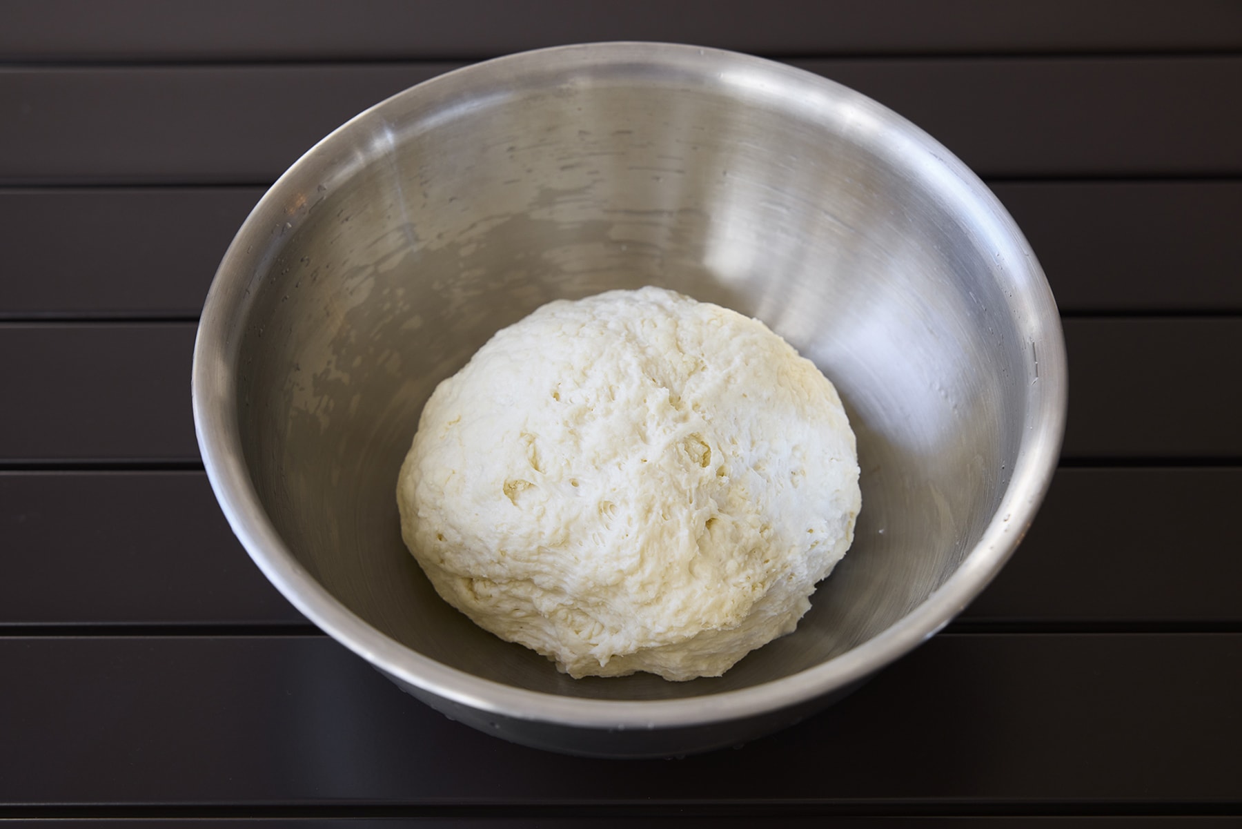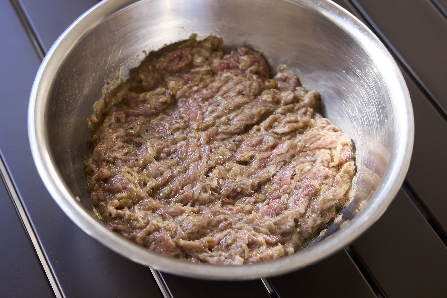 3.フライパンの表面をキッチンペーパーなどで軽く拭いたら、オリーブオイル大さじ1杯を引き、2を中火で焼く。