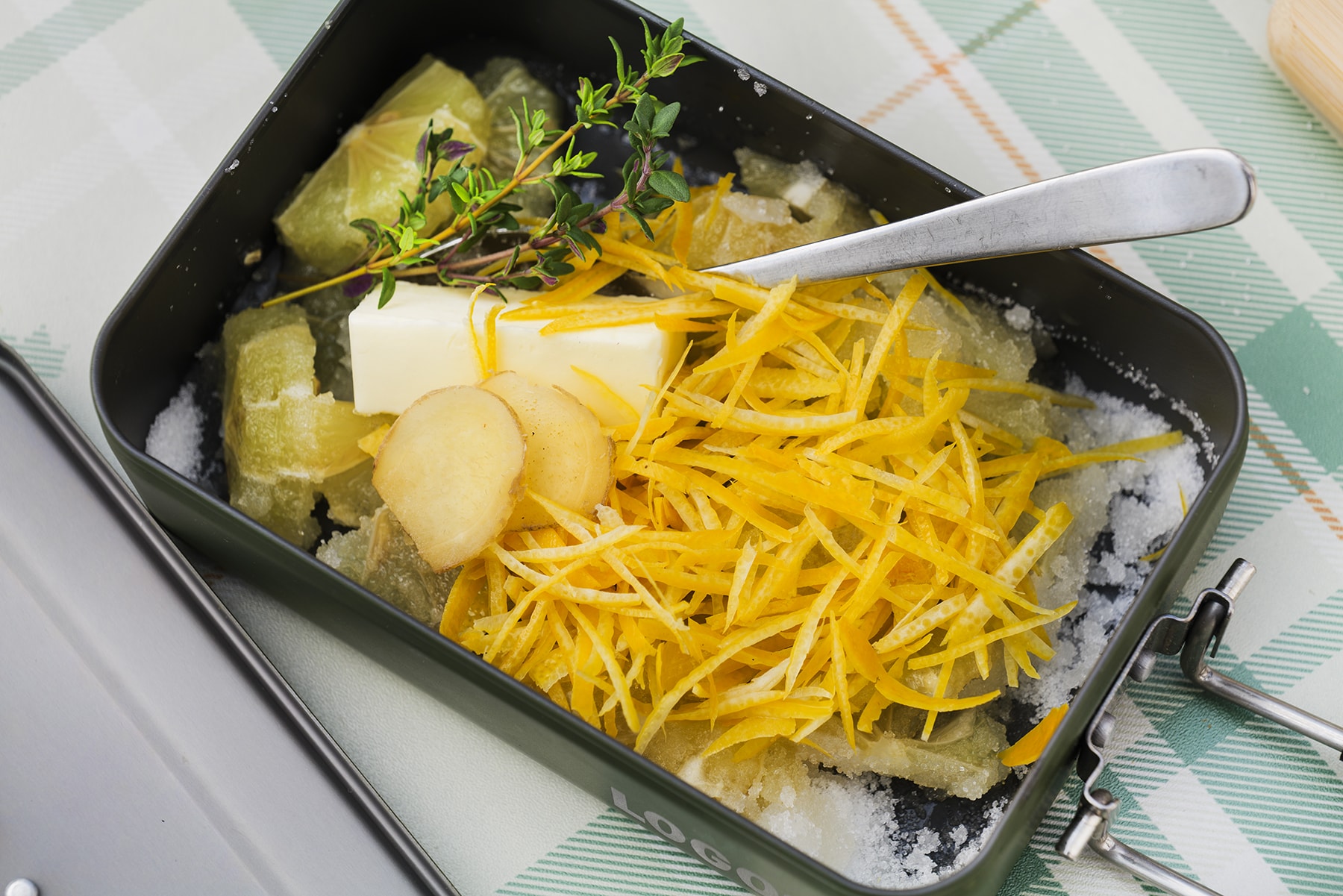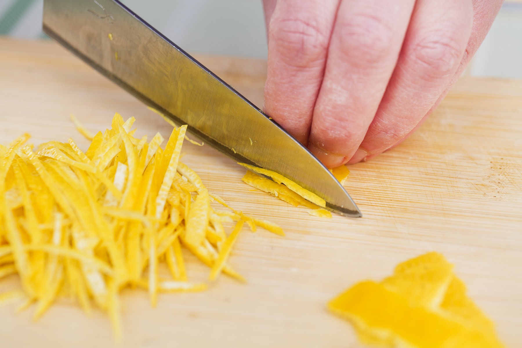 1. レモンの外皮を薄く切り取り、細切りにして水に15分ほどさらす。