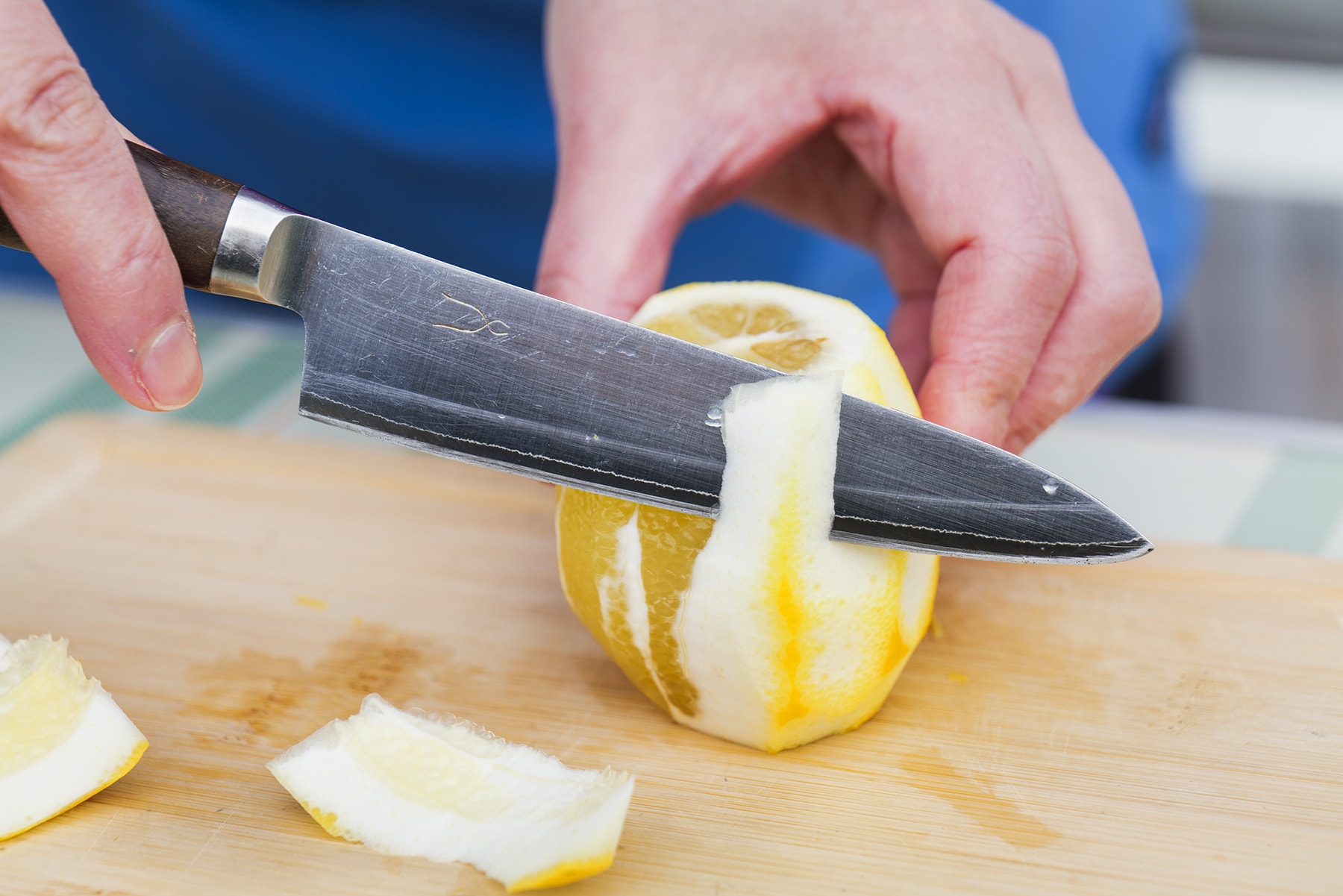 2. 1の白ワタを切り落とし、果肉を薄切りにする。