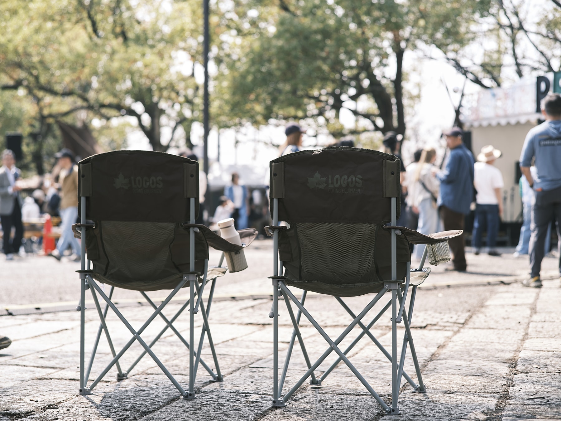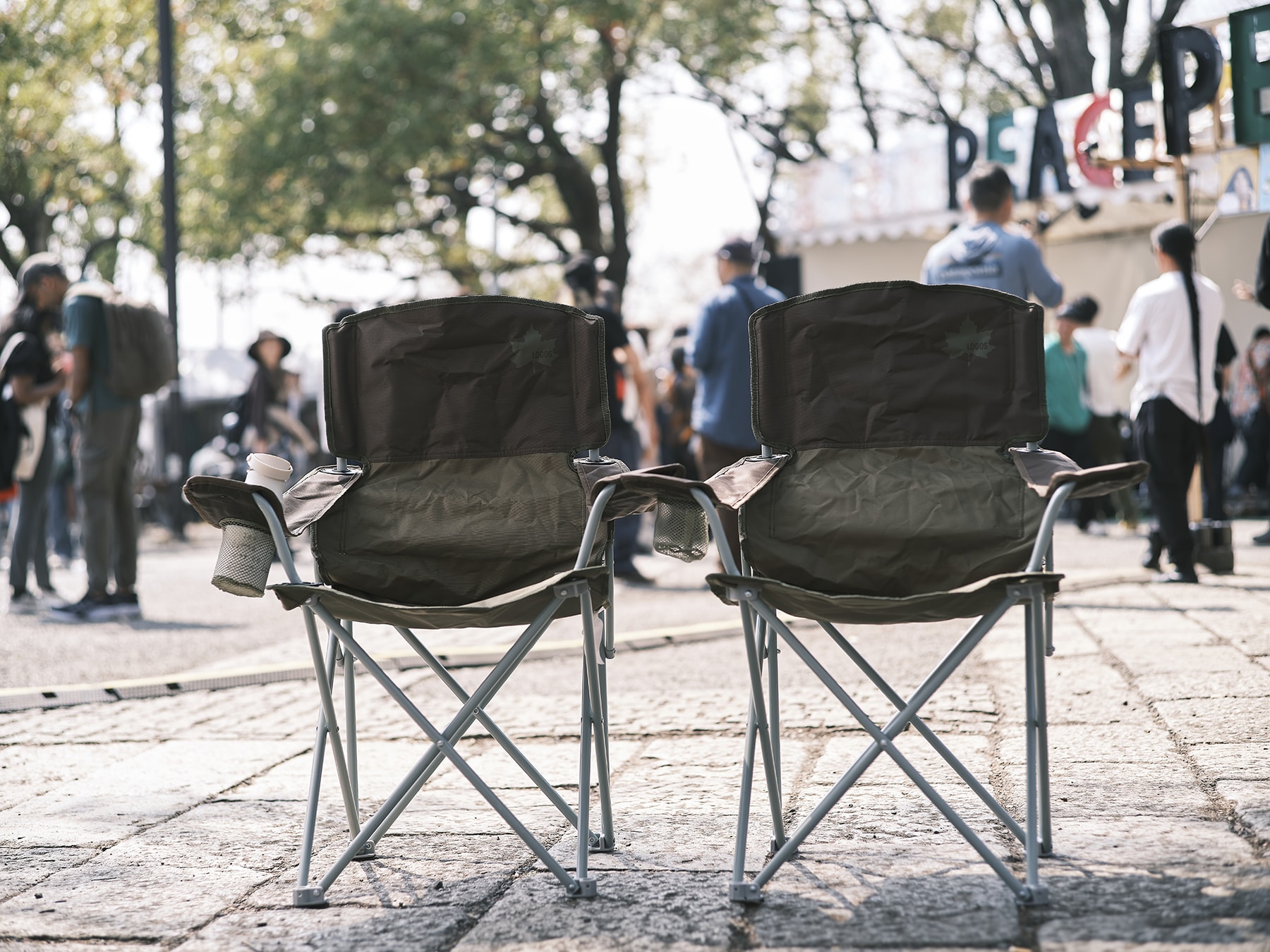 YUKKO!さんとPSYPAPAさん、ありがとうございました。おふたりに座ってもらったのは、腰部をしっかりサポートしてくれる「バックアシストアームチェア」。背もたれのラウンドが腰をしっかりサポートし、長時間座っても疲れにくいのが特長です。座面の高さは43cmと、フェスなどですぐに立ち上がりたい時に最高の相棒になります。ドリンクホルダー付きで、飲み物をこぼす心配もありません。