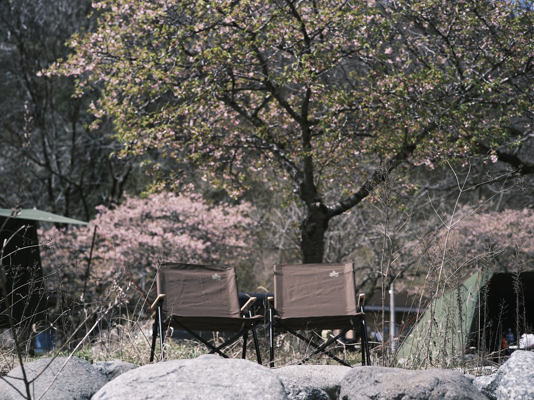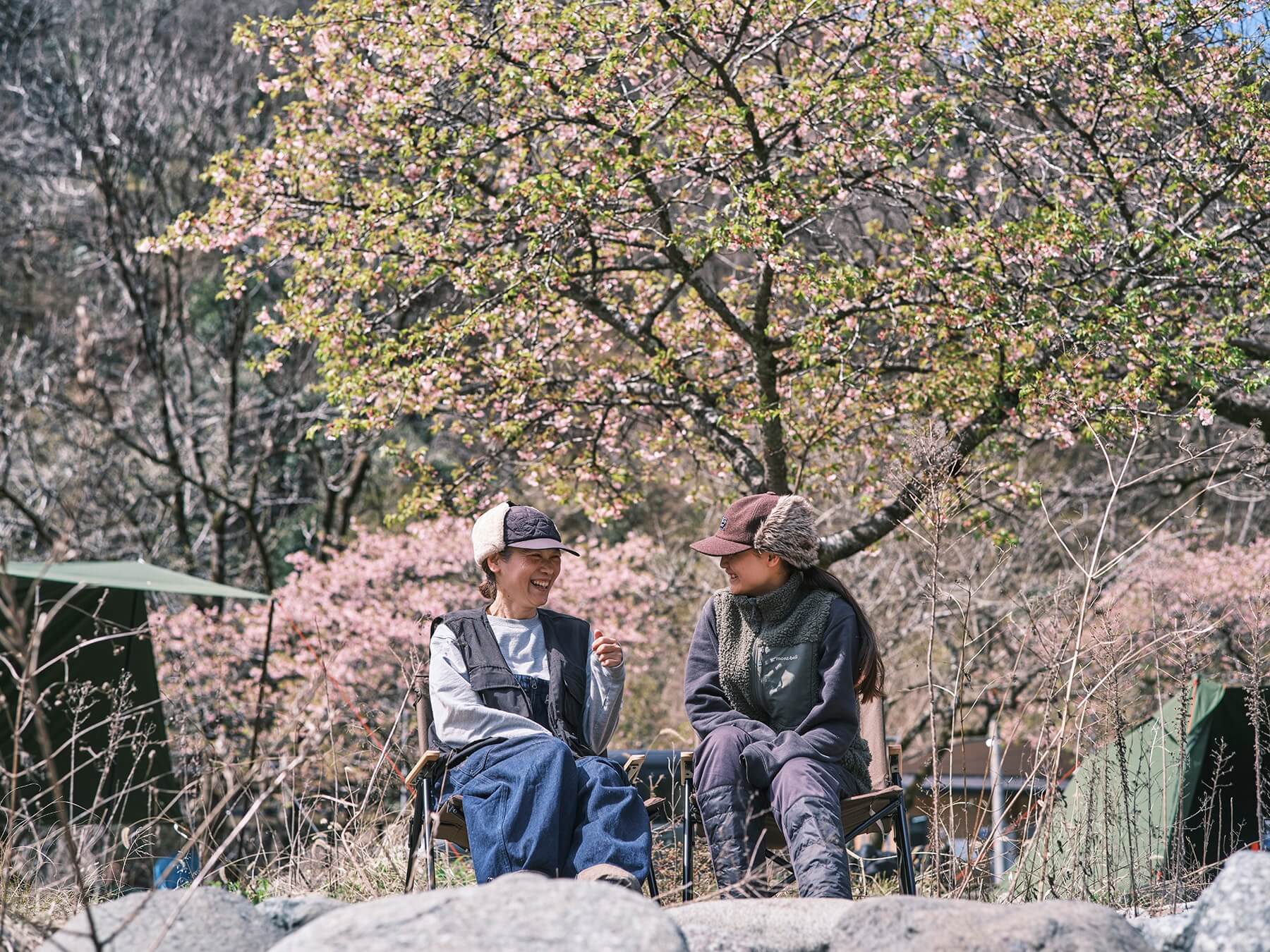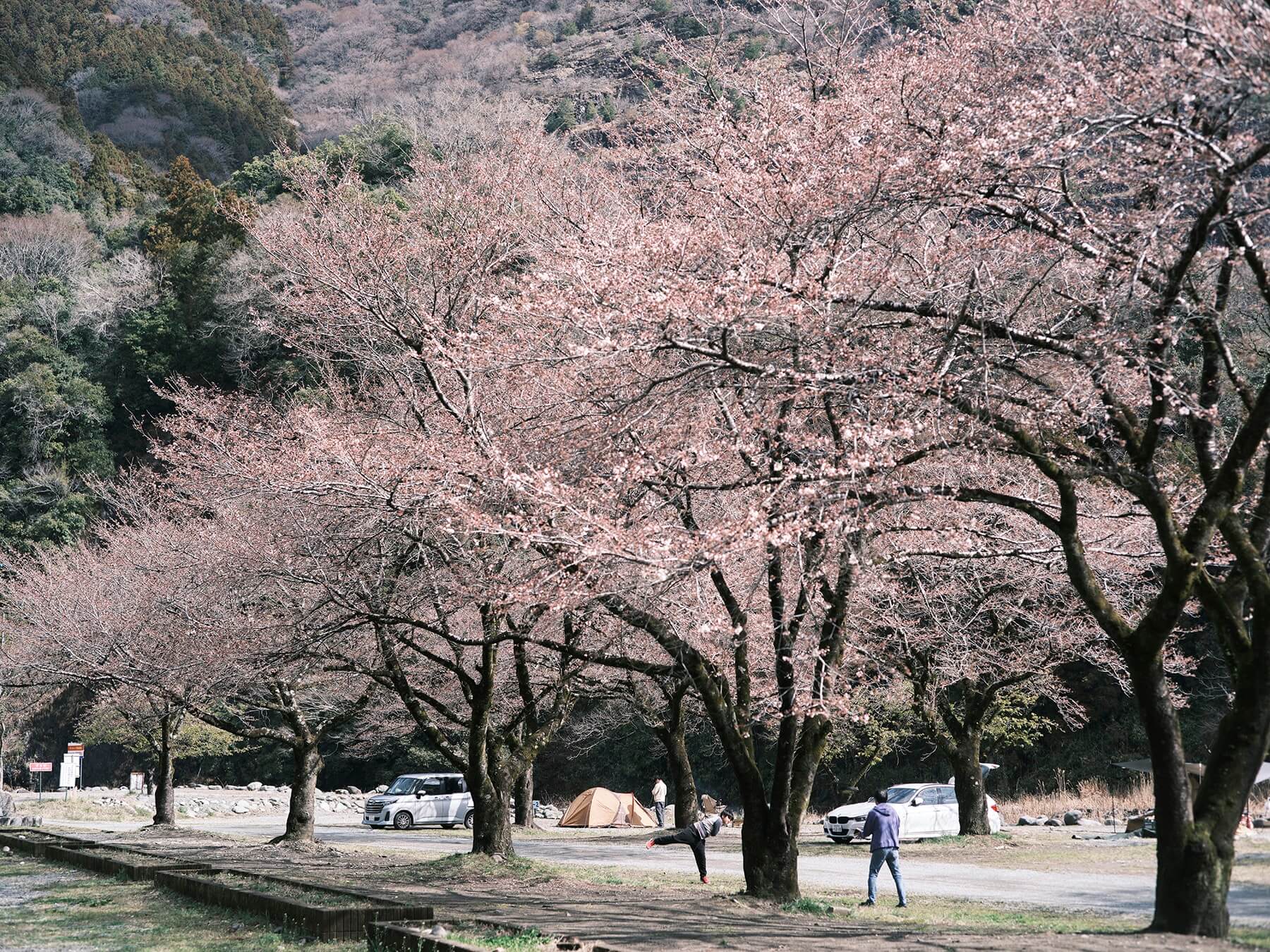さてさて、編集部の小さな旅のラストは「青野原オートキャンプ場」へ。秋は紅葉が美しいキャンプ場で、春はいろんな種類の桜が絶景なのです。取材時は、河津桜の見頃が終わり、あともう少しでソメイヨシノが咲き誇りそう……というあたたかい一日でした。