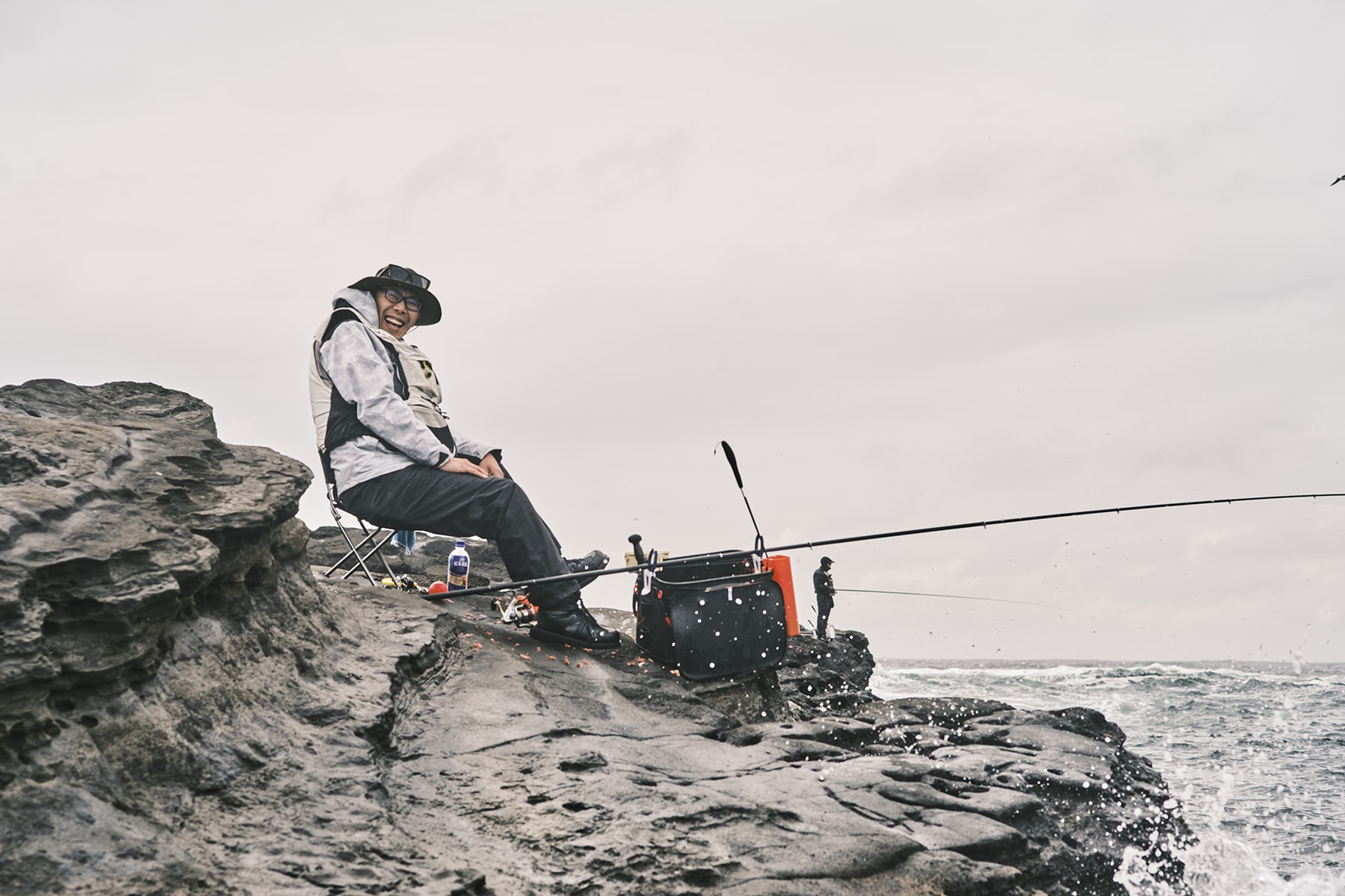 義夫さんは、有名釣具店の副店長さん。どうりで、竿さばきが上級者然としておりました。今回のような磯釣りの際にはチェアは不要とのことですが「休憩用には軽くていいですね!」とリアルな感想を教えてくれました。