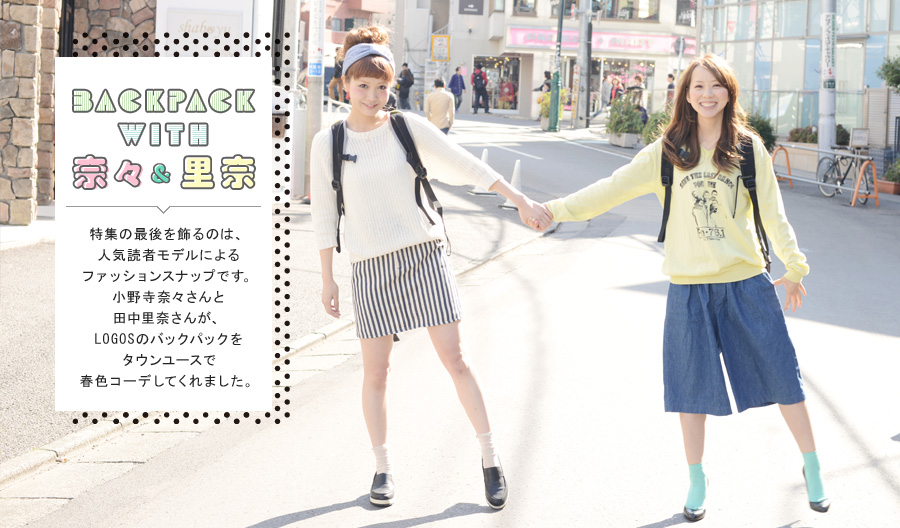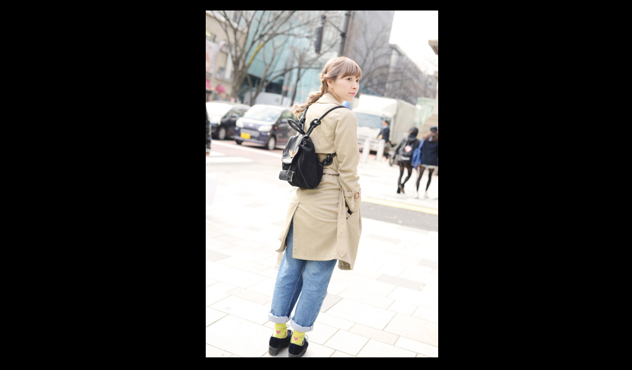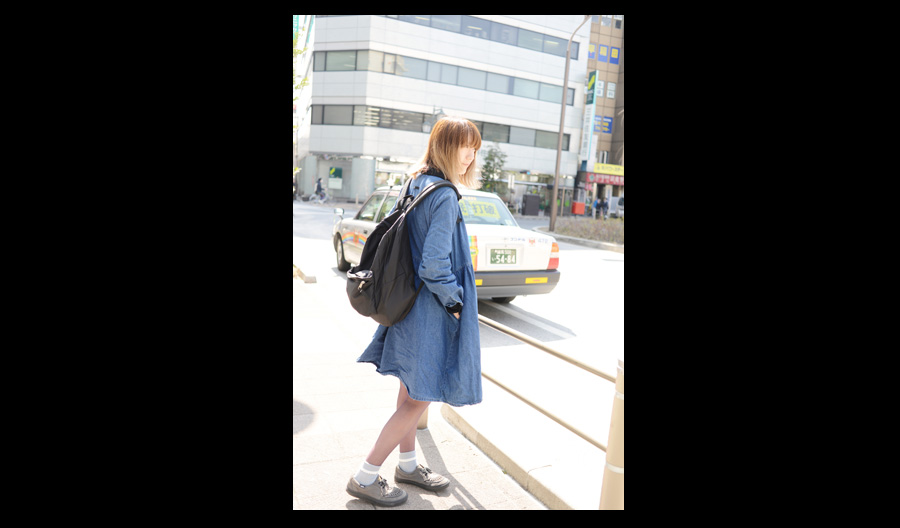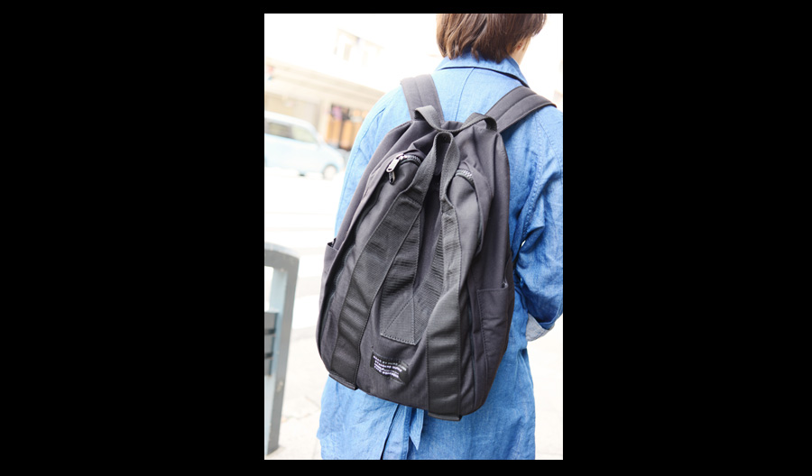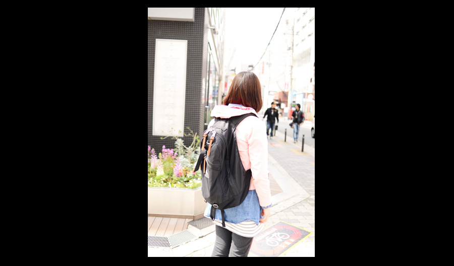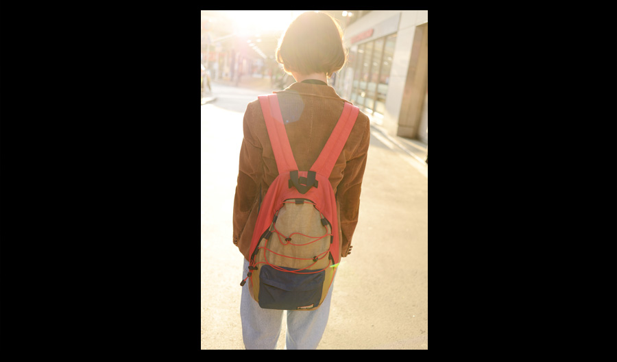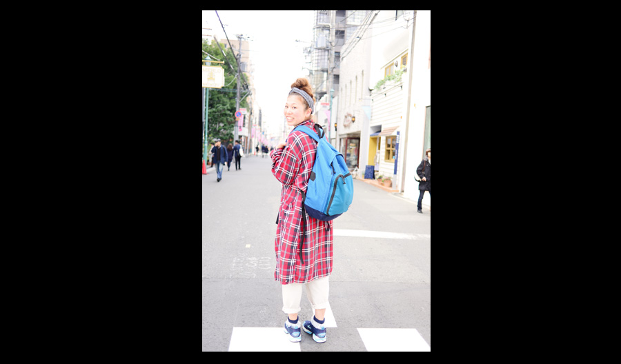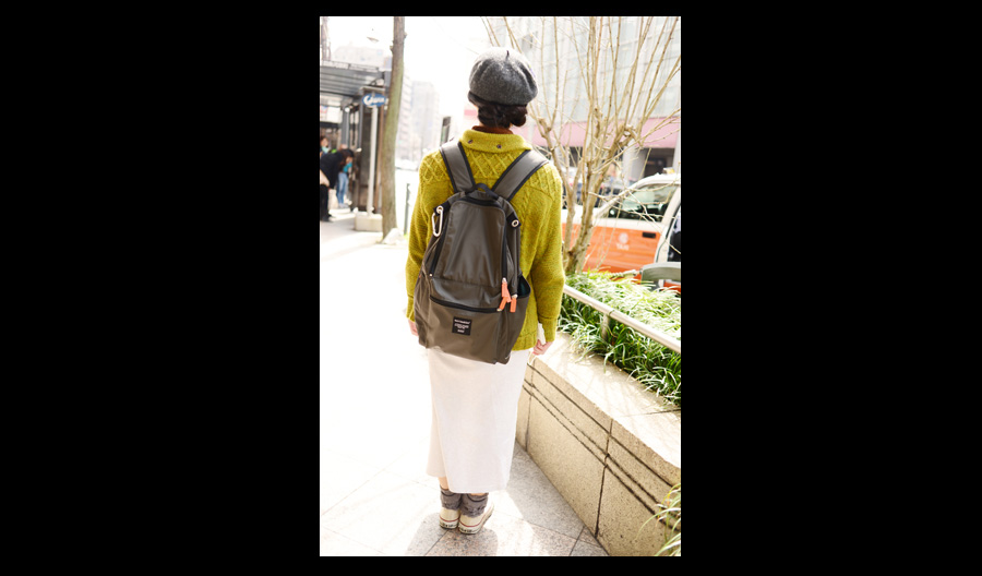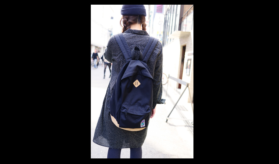 お散歩大好き少女の彼女は、「スピンズ」のバックパックを。黒が合わせやすくて好きだとか。
