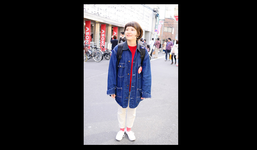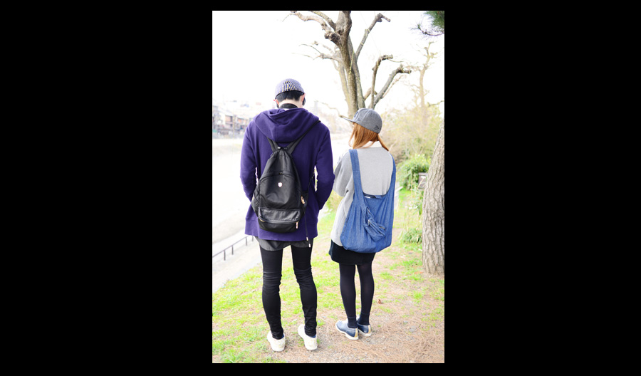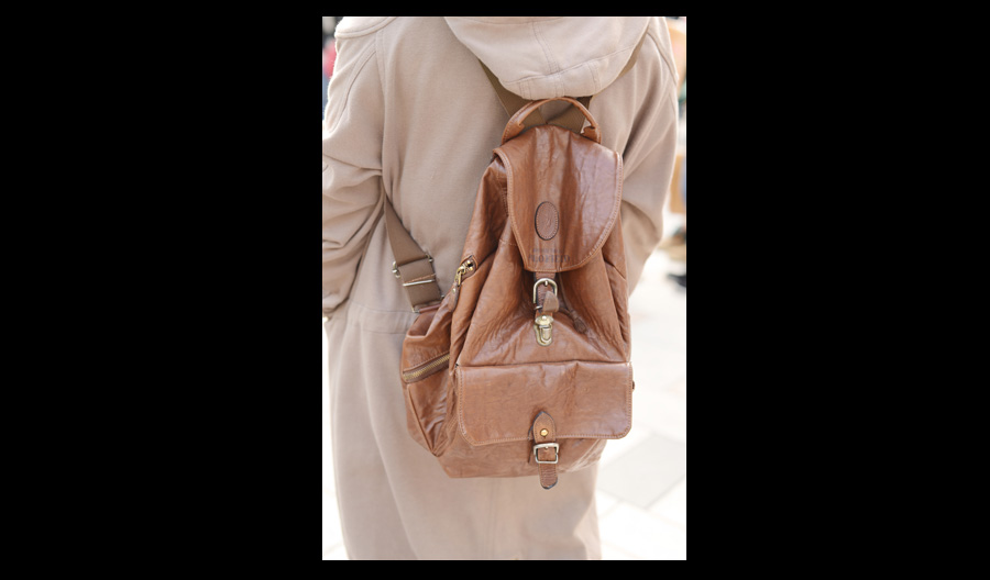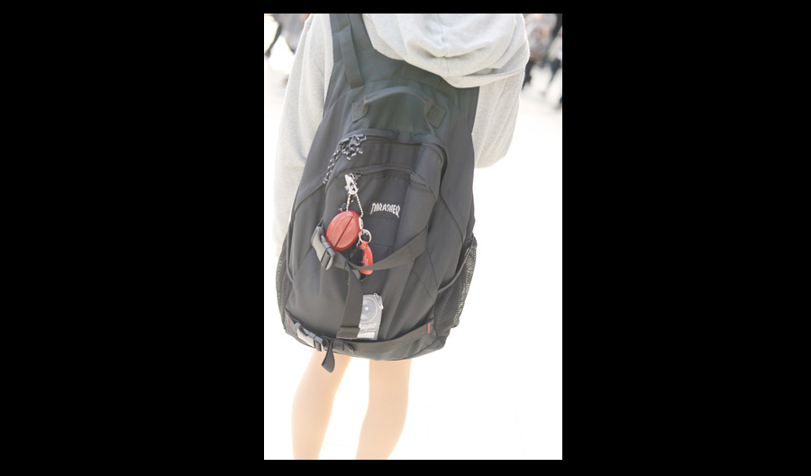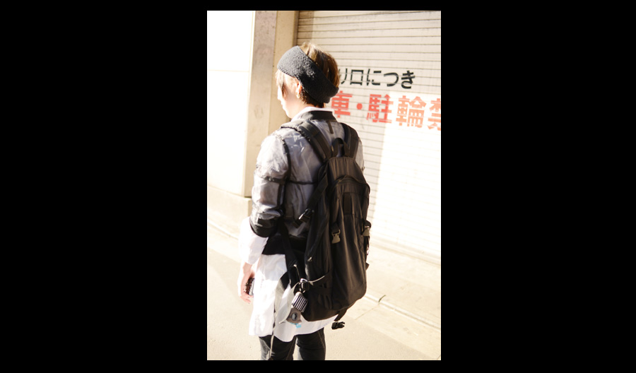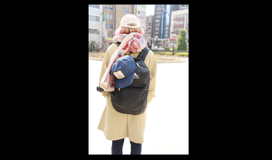 梶原さんのバックパックは韓国で購入。「最初は白かったのに、使い込んだら味がでてきました」。