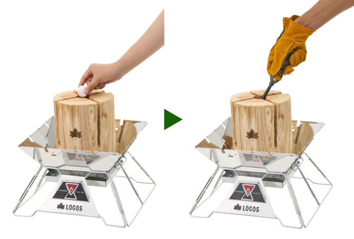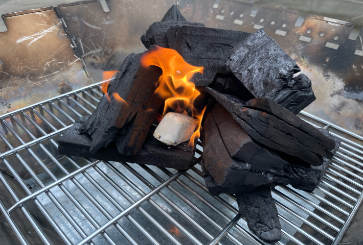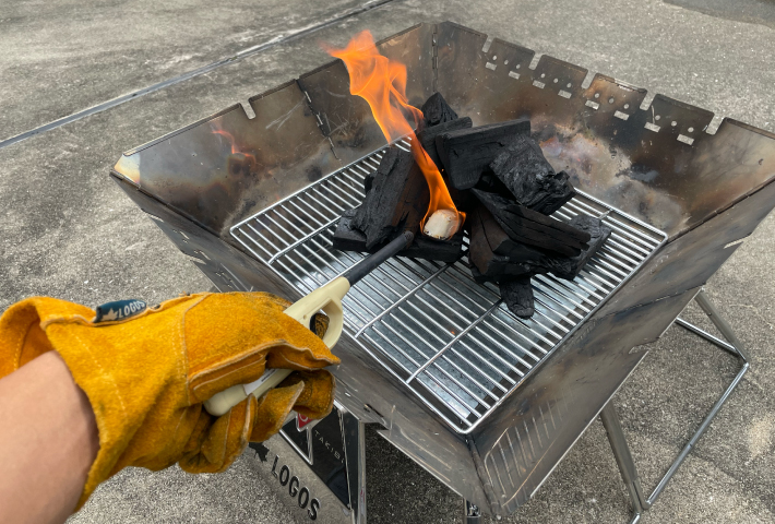 2)その上に木炭等を置き、柄の長いライター等でファイヤーライターに着火してください。