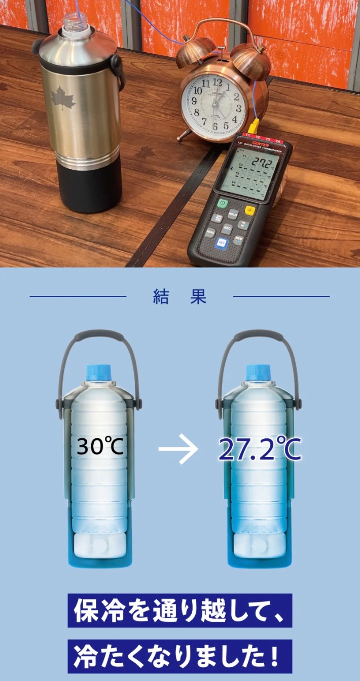 一方、本品を使用した方の水温は8.2℃と冷たいと感じる冷水状態をキープし、温度上昇スピードを1/5以下に抑えられました。
