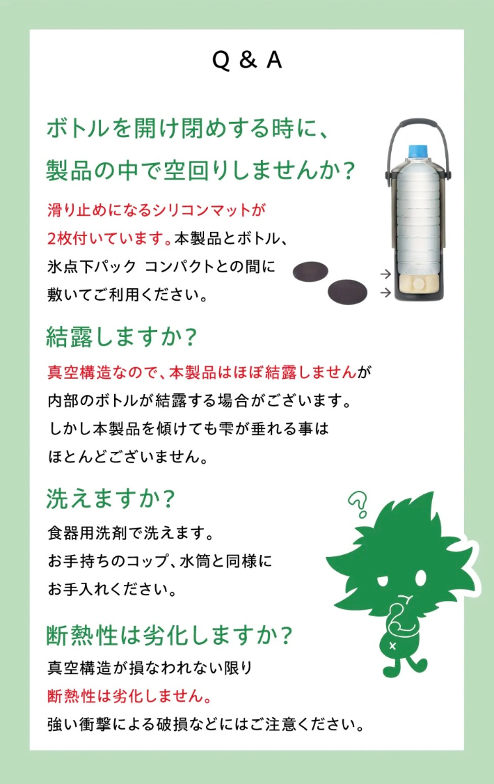 さらに、別売の氷点下パックコンパクトを併用すれば、高い保冷力を発揮し、底上げ効果によりショートボトルにも使えます。