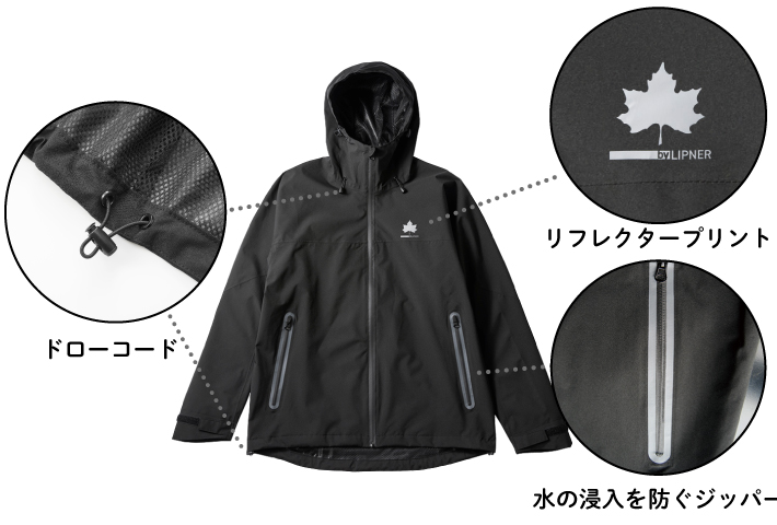 耐水圧10,000mm・透湿10,000g/m²・24Hの高機能素材を採用し、雨を防ぎつつ衣類内部の湿気を逃すことでムレを軽減。