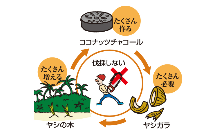 いつの日か生まれたヤシは今日も実をつけ、新たに育ったヤシも実る。」この循環型の利用方法は森林の育成や、CO2削減にも繋がっています。