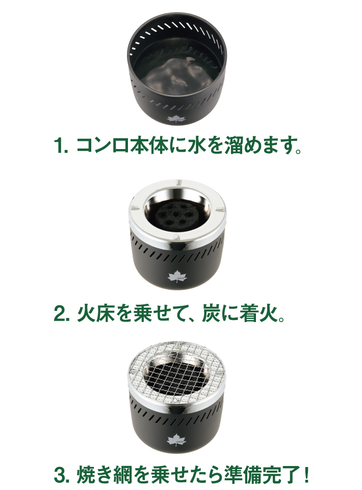 推奨燃料の「ミニラウンドストーブ」を1個セットするだけで、手軽に炭火グリル料理が楽しめます。