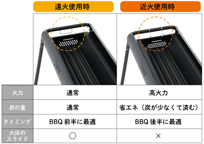 火床が左右にスライド可能=炭足しが簡単!