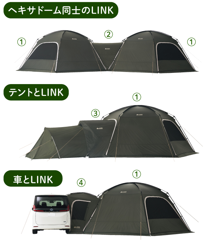 別売りの「コネクトベースシリーズ」を組み合わせれば、テント・車・タープを連結することで無限にレイアウトが可能。