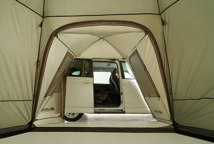 ミニバンや軽ワンボックスと別売りの「neos コネクトベース・ヘキサドーム 600-BF」を連結し、居住空間を拡張できるアイテム。