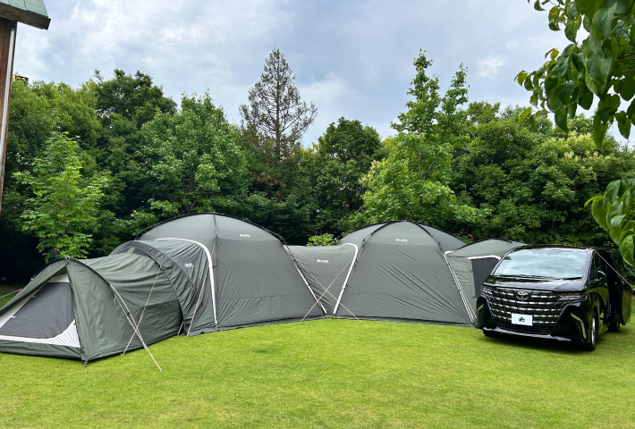 雨天時でも濡れずにテントと車の移動がしやすく、快適な動線を確保できます。