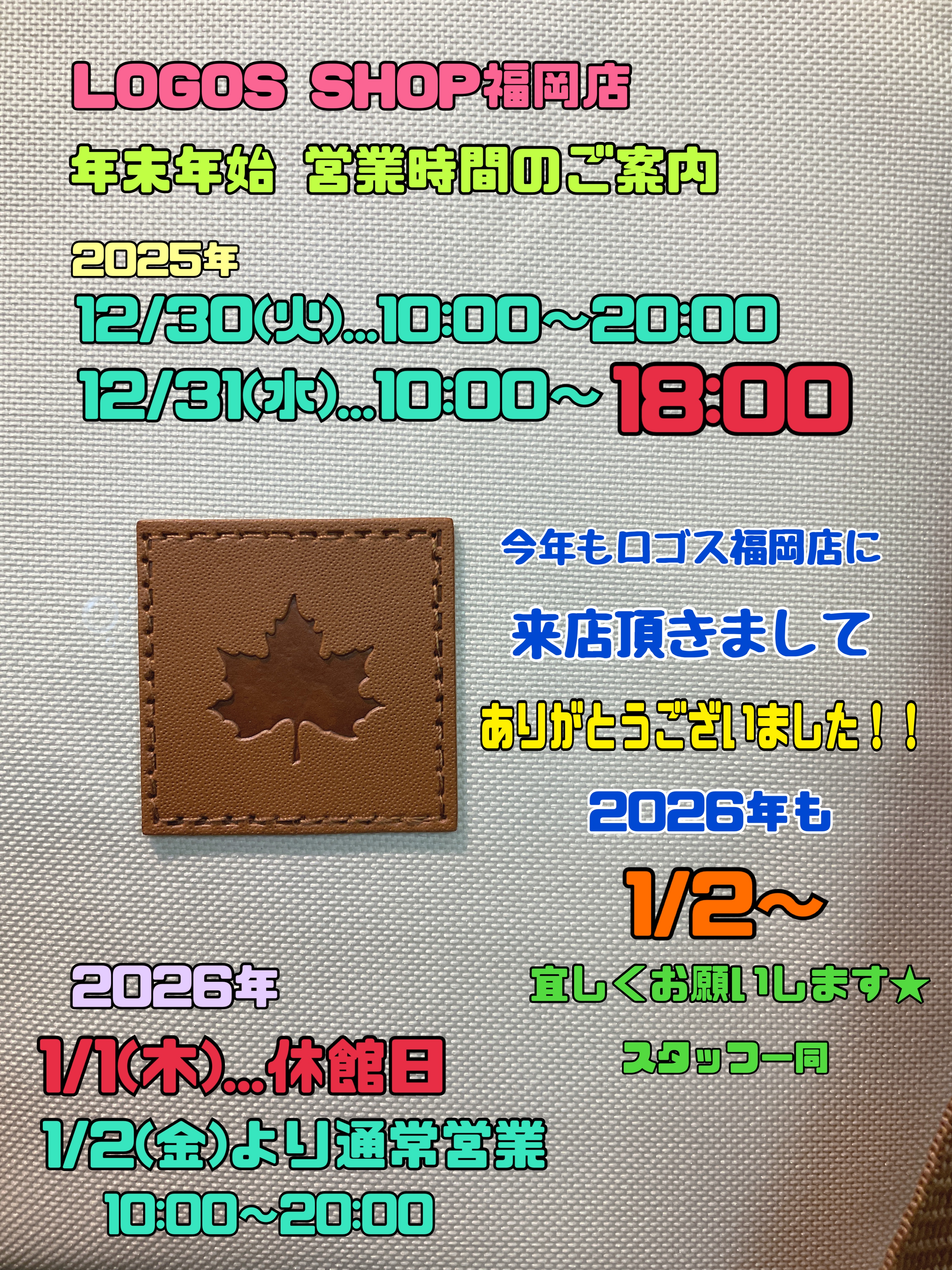 LOGOS SHOP福岡店 年末年始・営業時間のご案内🗓