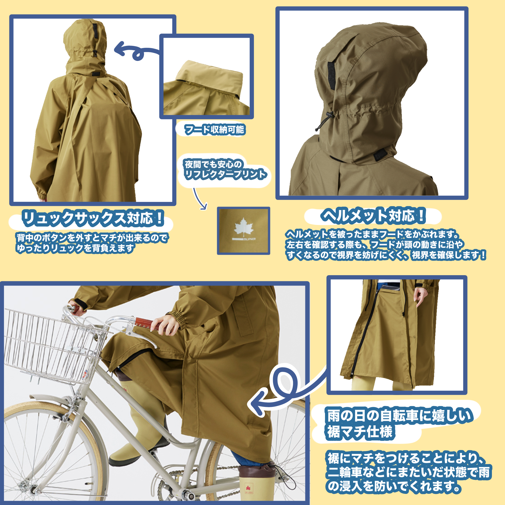 ヘルメットやリュックの上からも着用でき、自転車にまたがった際に足元へ雨の浸入を軽減するマチを搭載するなど、嬉しい機能が満載です!