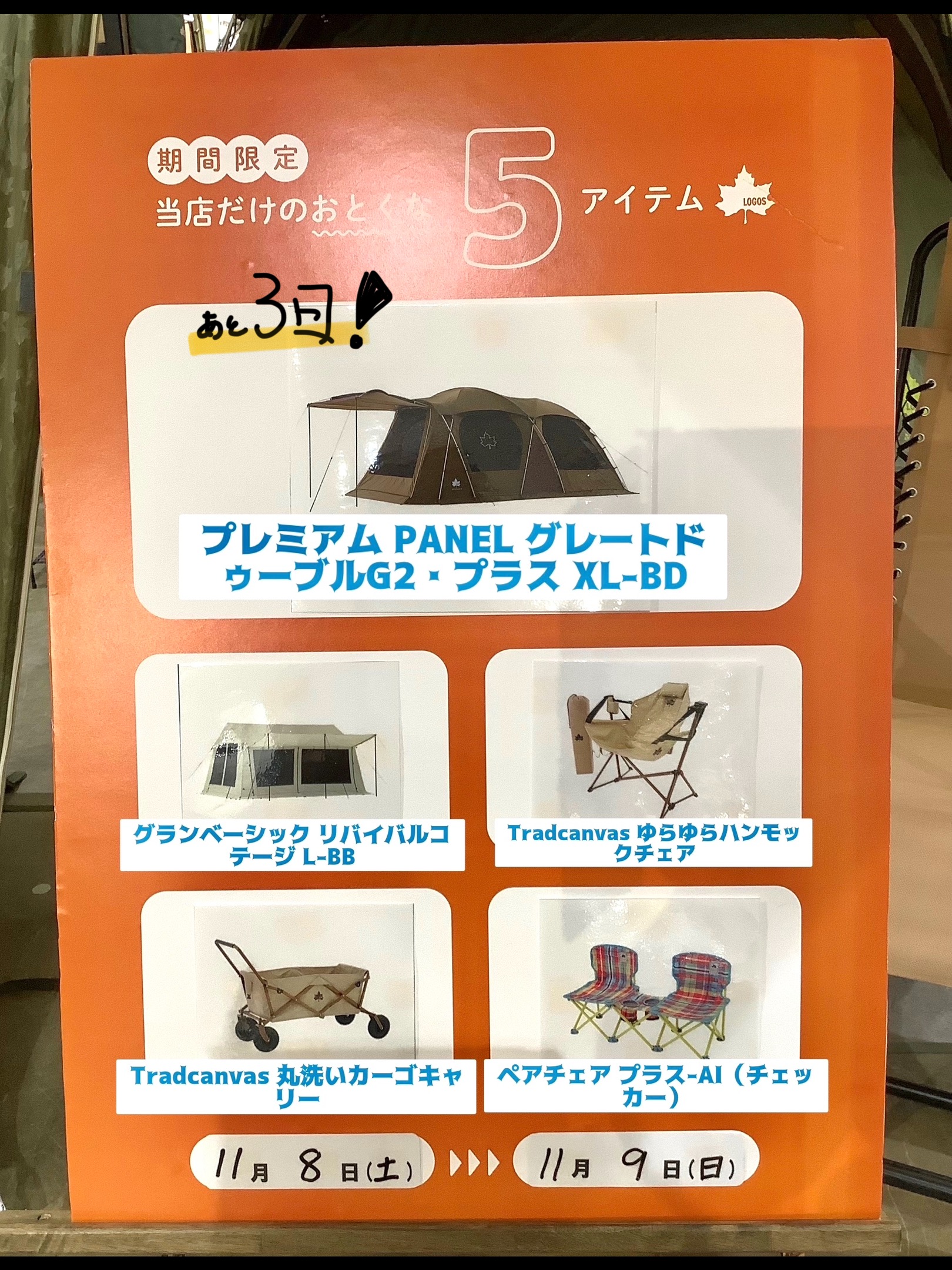 厳選のアイテムがお得になったり、色んな種類のテントを見たり触れたり出来る一週間で、