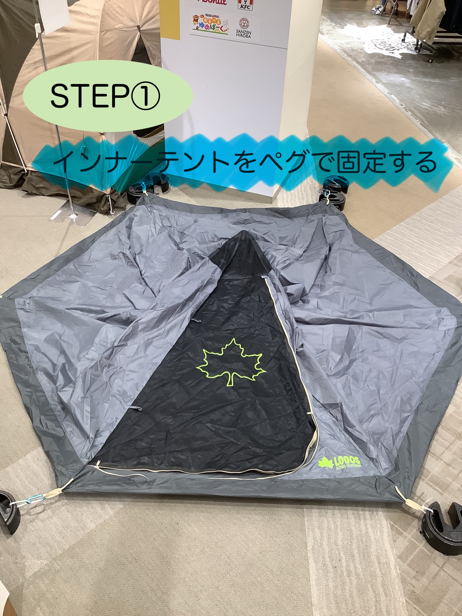 ①インナーテントをペグで固定する