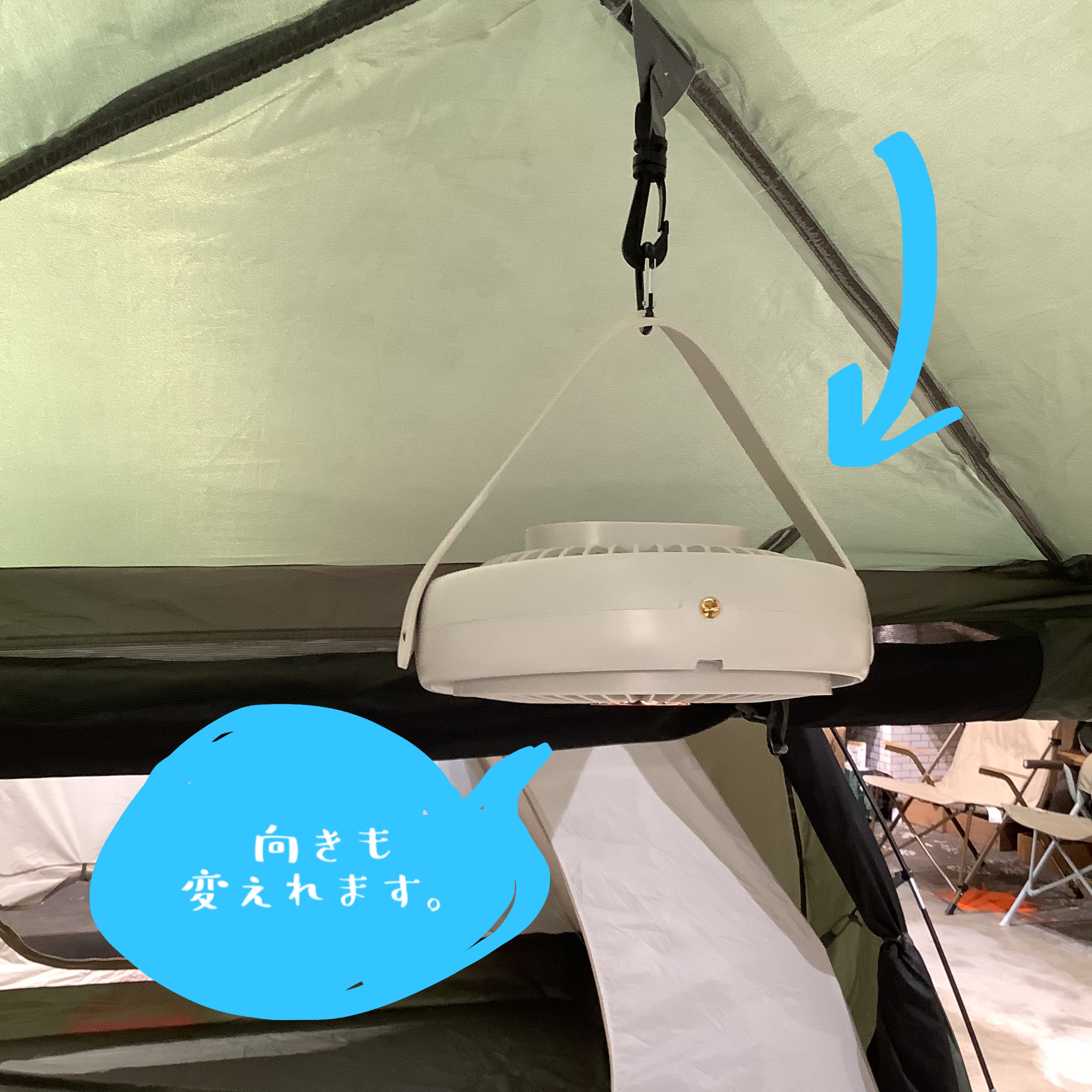 シリコン製ハンドルとカラビナ付きでテント内に吊り下げられるほか、三脚ネジ付きで卓上設置も可能(三脚は付属していません。)。