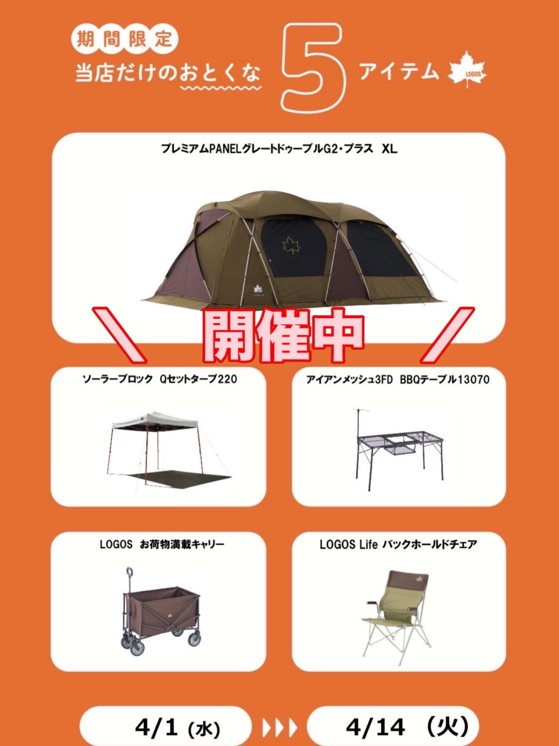 ロゴスショップくずはモール店でも厳選した5アイテムが期間中お得にお買い物できます。