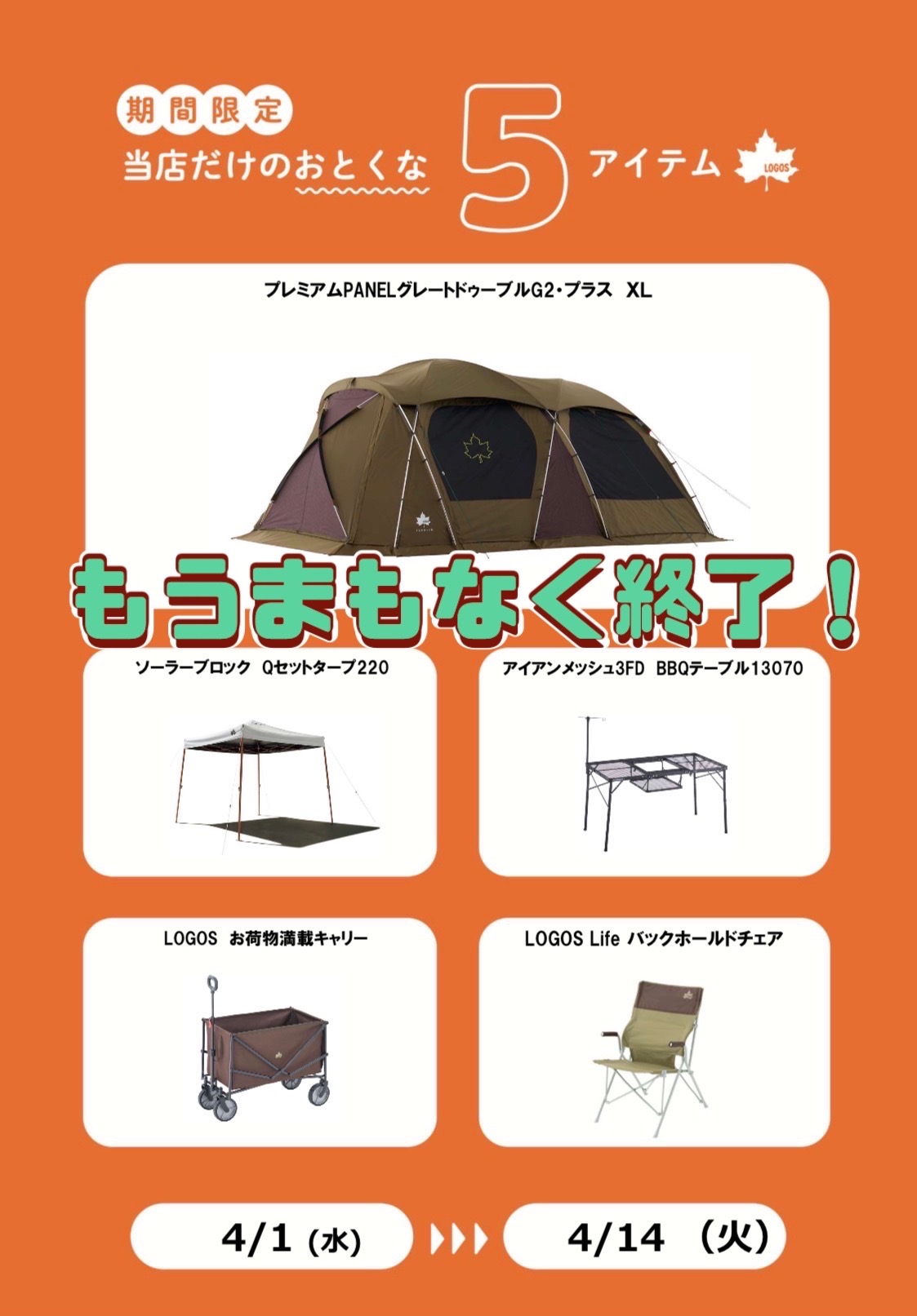 ロゴスショップくずはモール店でも厳選した5アイテムが期間中お得にお買い物できます。