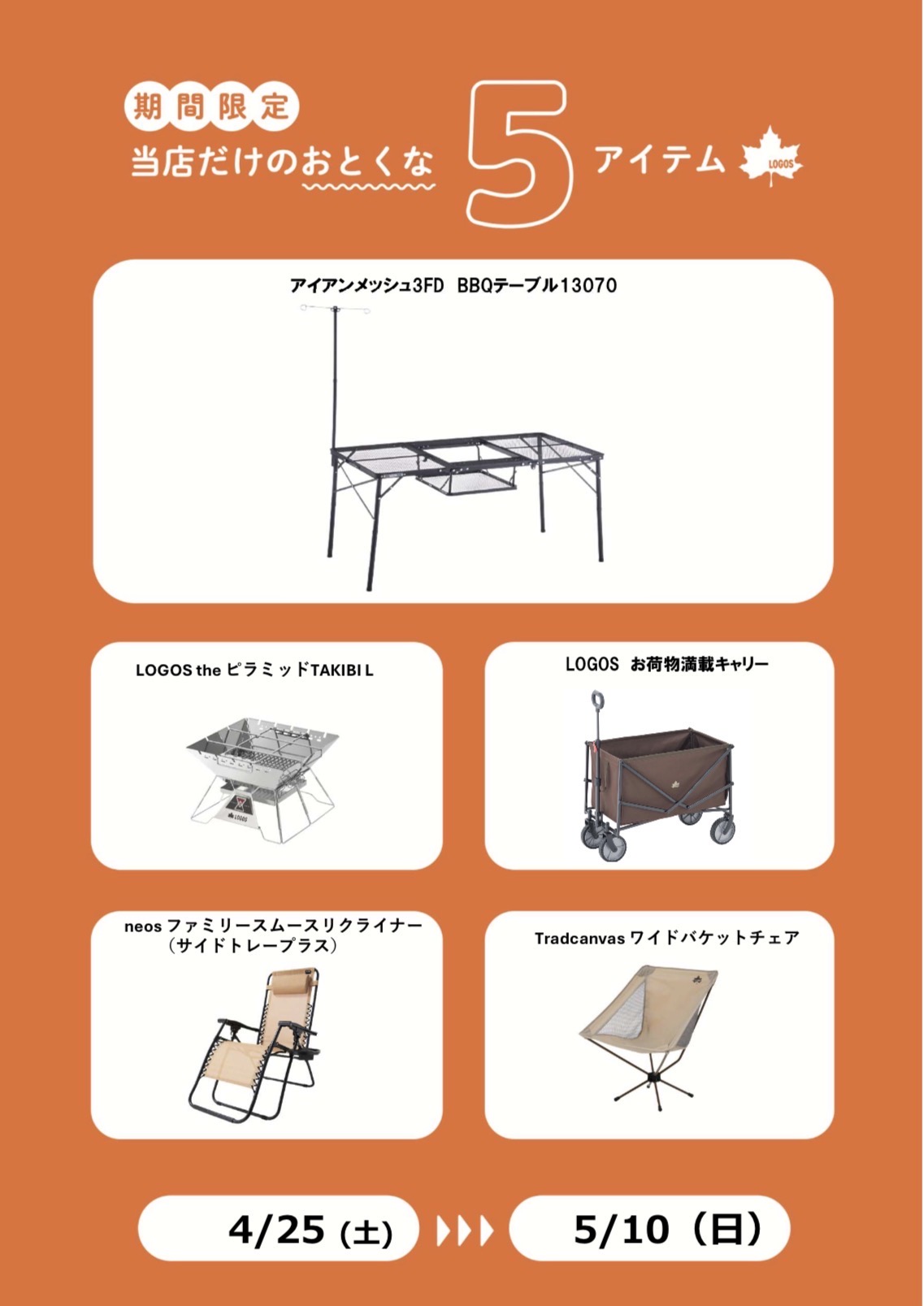 ロゴスショップくずはモール店で厳選した5アイテムが期間中お得にお買い物できます。