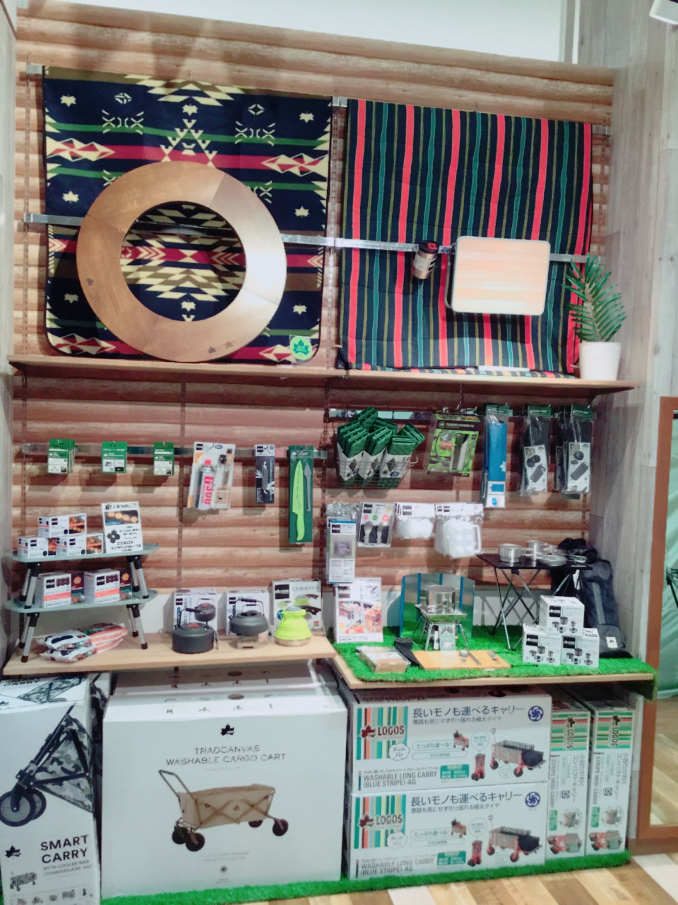 はい、壁面展開中の断熱防水ピクニックマットやアウトドア小物を揃えた