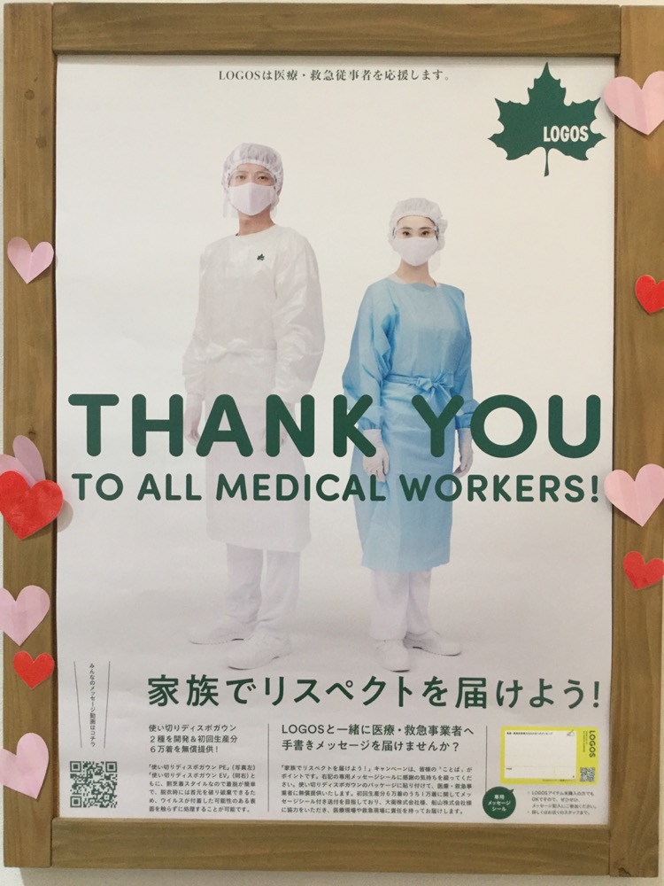 ロゴスで医療・救急従事者の方々に無償提供させて頂く、使い切りディスポガウンのパッケージに皆様の手書きメッセージを貼り付けて、感謝の気持ちを届けよう!というキャンペーンになっています。