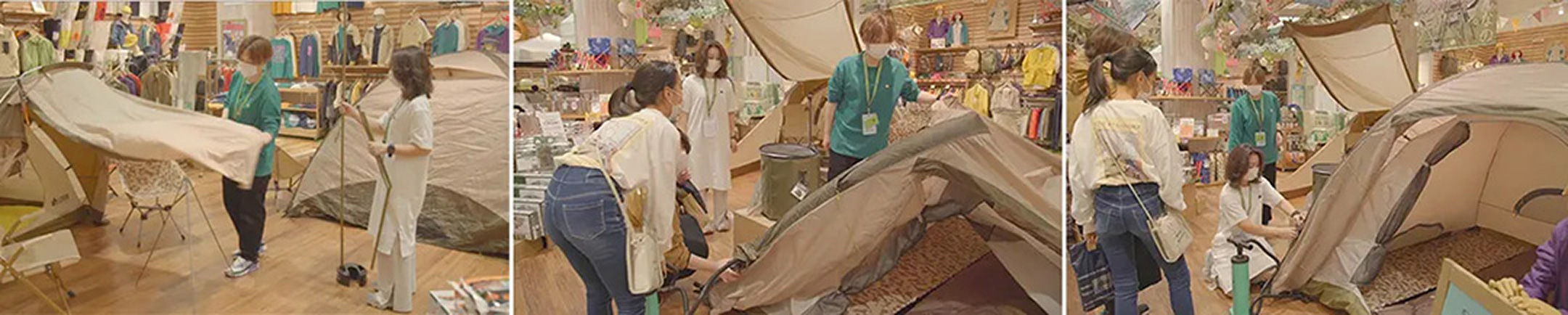 キャンプの最重要アイテム=テントを実際に見て、触って、組立て体験できる7日間。