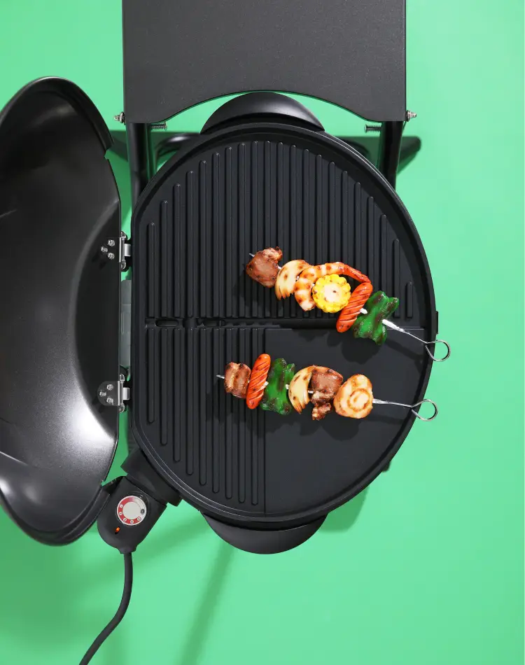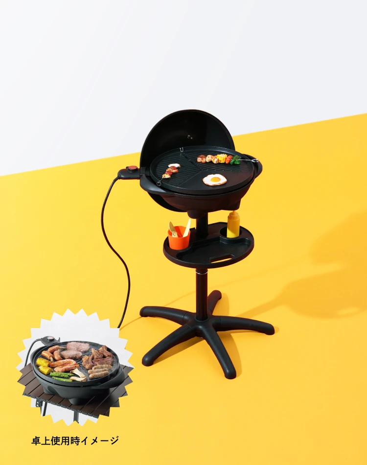 コンパクトサイズの電気式グリルは、少人数のBBQなどで活躍。スタンド部分から取り外してホットプレートのようにテーブルの上でも調理できます。スタンディングBBQはもちろん、卓上BBQも楽しめる2WAY仕様。