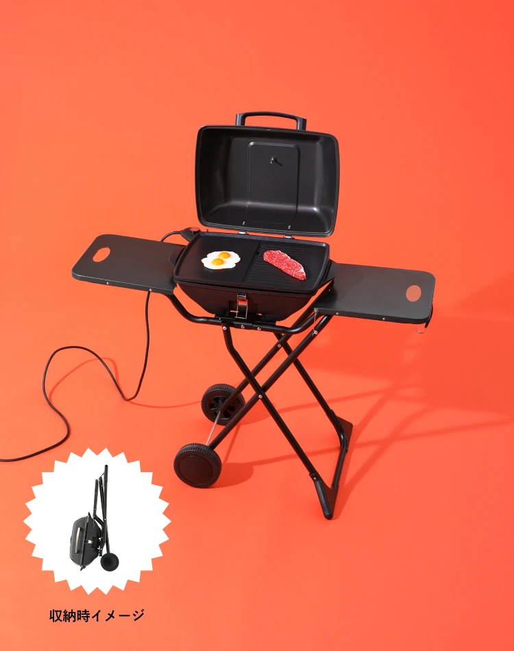 コンセントに挿すだけ、火おこしいらずでBBQできる電気式グリル。プレートに熱源が内蔵されているため食材に火が通りやすく、フタをすれば蒸し料理にも対応します。余分な脂が流れ落ちる構造により、焼き上がりはとってもヘルシー。プレートは、焼肉などに適した波型構造のエリアと、焼きそば作りなどに便利なフラット構造のエリアにわかれています。