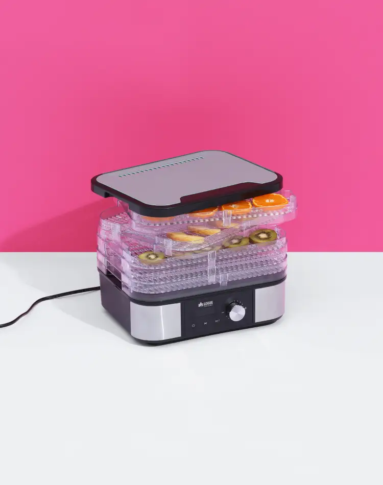 ドライフルーツや干物などをアウトドアで作れるユニークなアイテム。たとえば果物の場合、カットしたものをトレーに並べ、温度を45℃に設定し、タイマーをセットして約5時間待てば完成です。5段トレーで一度にたくさんの食材を調理でき、350Wと省エネな消費電力&お手入れの簡単さも魅力。